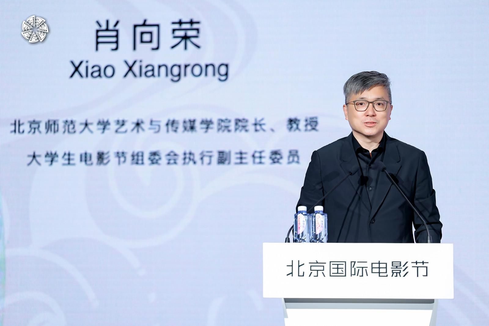 肖向荣在致辞中高度肯定大学生电影节32年历程与中国电影120年发展成就,并结合世界电影130年历史,提出对中国电影基因传承的思考,强调从《定军山》起中国电影便高度注重人文关怀。围绕论坛主题“影像实验与时代想象”,独到地阐释电影作为实验艺术的本质,呼吁创作者以真诚突破套路。面对生成式影像技术革新带来的机遇与挑战,肖院长倡导电影创作者坚守艺术初心,在民族文化回望中探索影像可能性。最后寄望本次论坛能够自由碰撞思想火花,为中国电影发展注入新活力。