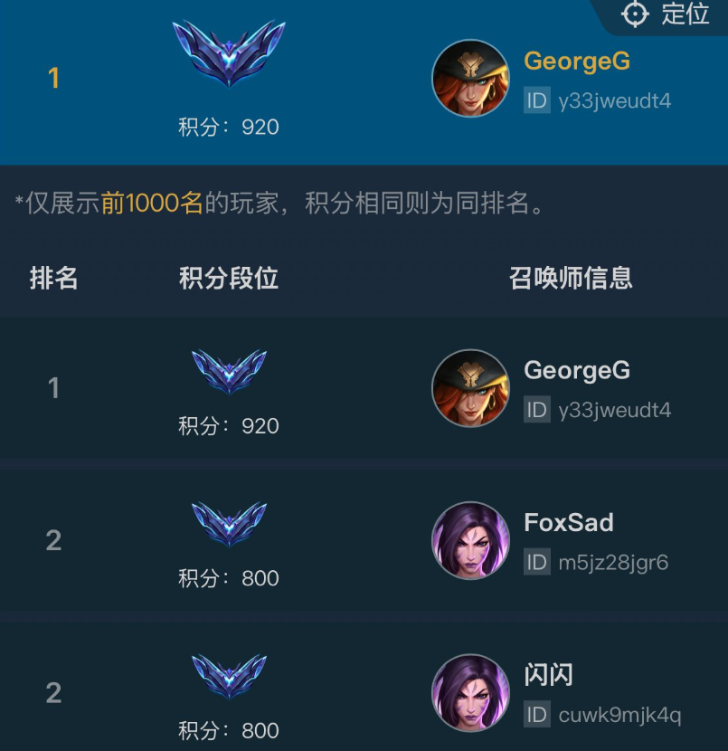 《英雄联盟》实体对战卡牌游戏《符文战场》,在本周正式上线了积分排名系统,玩家可以通过参加城市挑战赛、区域公开赛来获得积分。目前在积分榜排名前列的,自然是此前四个区域公开赛的冠军选手,其中,重庆站的冠军选手George以920分暂时排名第一。因为他四个公开赛都去参加了,广州站也打到了八强阶段,目前是钻石段位的920分,短期内都不会有选手超过他。不过,9月下旬的城市挑战赛开启后,其他三站的冠军有望超过他。