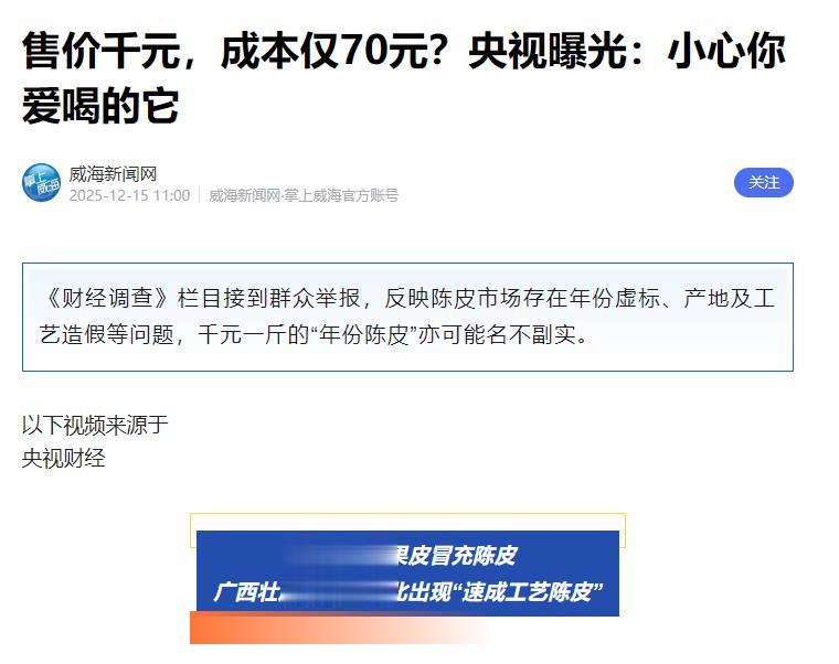 12月14日随着央视的调查曝光,大家这才发现“百年陈皮胜黄金”在部分人眼里却成了“摇钱树”。