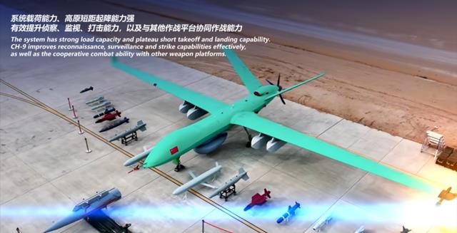 彩虹-9可以挂在各类小型空地导弹以及多种类型的电子战吊舱或侦察吊舱,同时还能挂载多类潜航器进行反潜侦察任务。