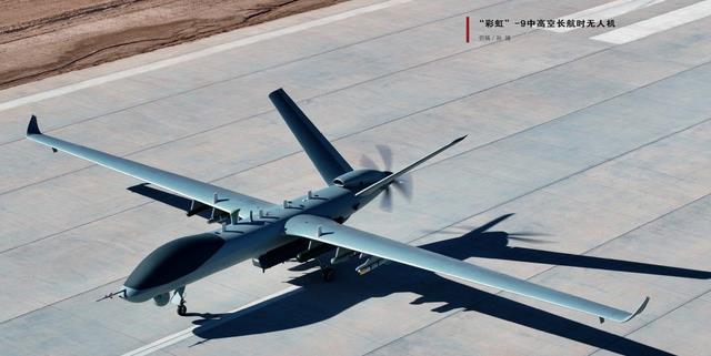 彩虹-9是今年在珠海航展首次披露和展出的型号,可以看做是彩虹-5的升级放大版,换装1台国产先进的AEP100涡桨发动机。彩虹-9翼展24.8米,最大起飞重量为5吨,最大载荷480千克,最大速度420公里/小时,实用升限11000米,最大续航时间40小时,最大航程11500公里。