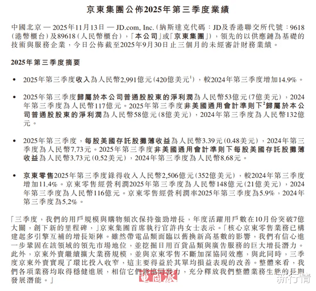 不久前,京东发布了2025年第三季度财报。财报显示,京东第三季度收入2991亿元,同比增长14.9%。
