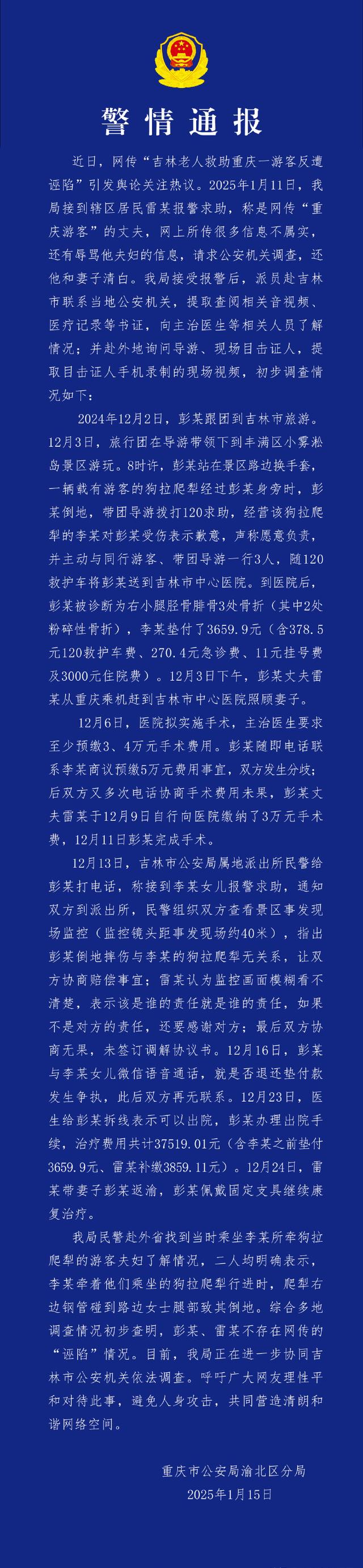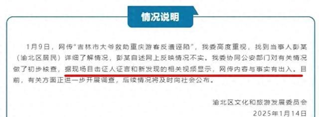 对于这个情况,重庆文旅一直没有给说法,直到14日,终于发布了声明,表示这事跟网上传的不一样,还在进一步的调查中,而15日,重庆警方一纸通报还原事件完整经过(大妈的摔倒就是吉林大叔拉的狗爬犁所致),结果又让吉林文旅成为了众矢之的。