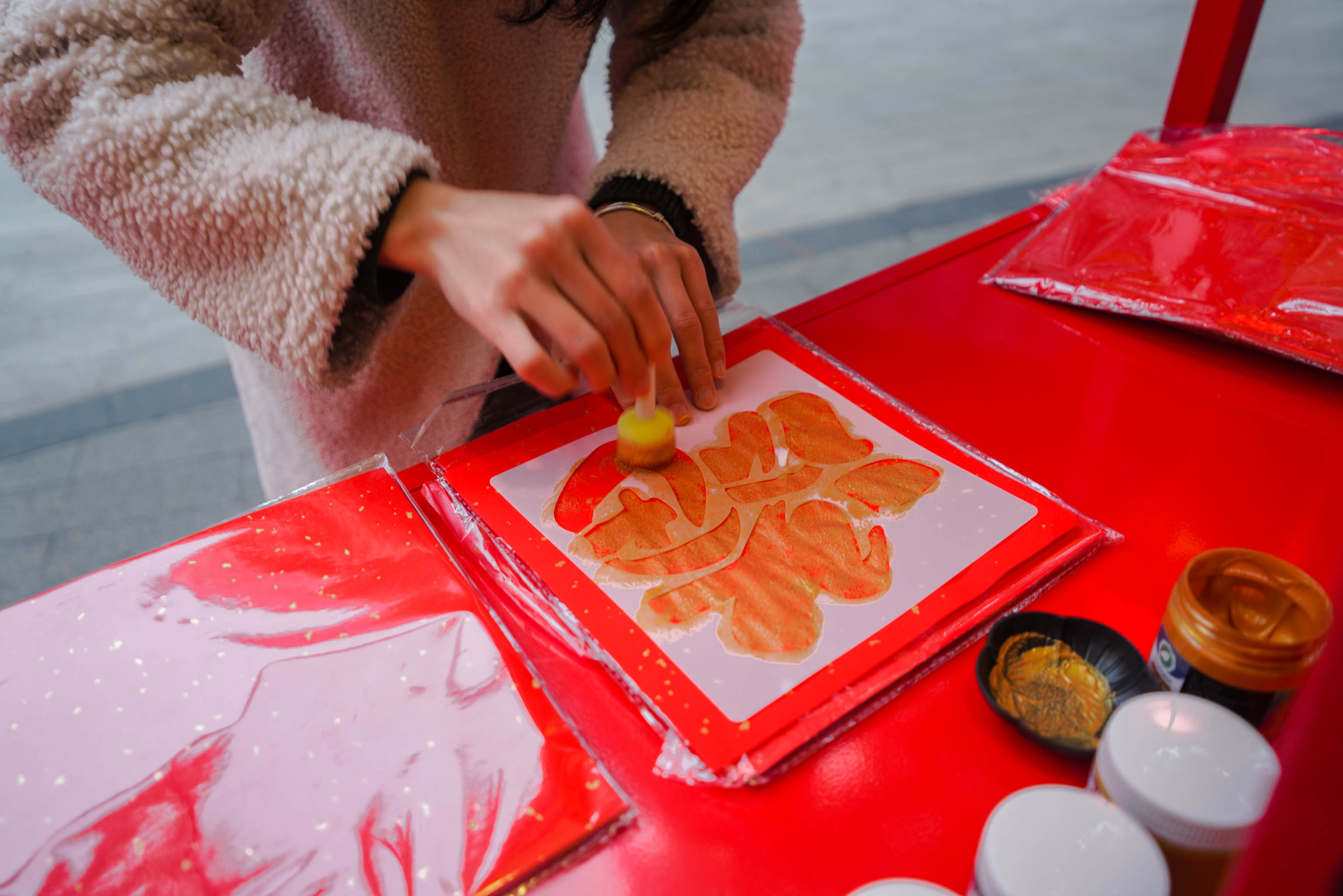 “祈福拓印”便是自己动手踏出愿望,可以是大大的“福”,也可以是“年年有鱼”等等,把福气带回家。