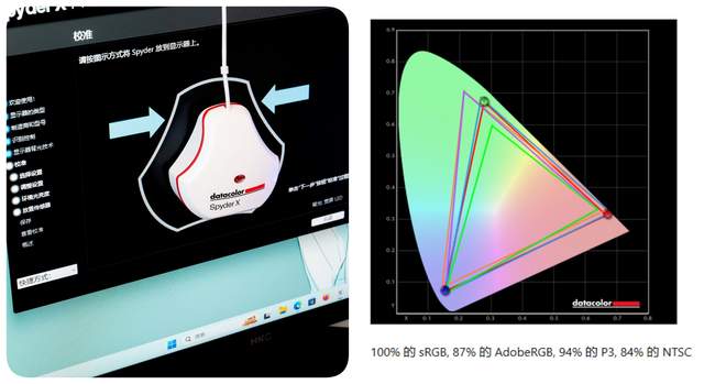 用校色仪对HKC G27H1进行测试,显示器全部设置都在默认模式时,sRGB为100%,AdobeRGB为87%,P3为94% ,NTSC为84% ,比官方宣称的参数还要略高一筹。