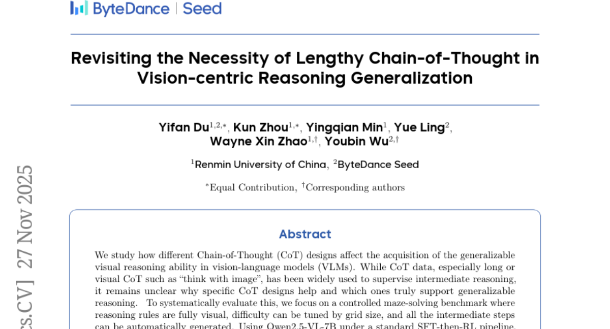 由中国人民大学和字节跳动种子团队联合开展的这项研究,于2025年11月发表在计算机视觉领域的重要期刊上,论文编号为arXiv:2511.22586v1。这项研究深入探讨了不同思维链条训练方式如何影响视觉语言模型在视觉推理任务中的泛化能力,揭示了一个颇为意外的发现:在训练AI进行视觉推理时,"短而精"的思维链条往往比"长而详"的推理过程更有效。