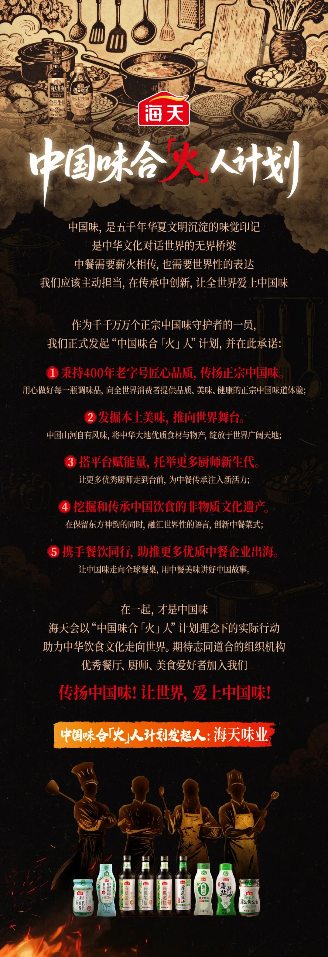 可以说,海天本次发布的“中国味合‘火’人”计划,发起正当其时。在中餐加速出海的背景下,这项计划联动了厨师、餐饮人以及社会各界,整合优势资源,助力中国味道被世界更多人了解和喜爱。