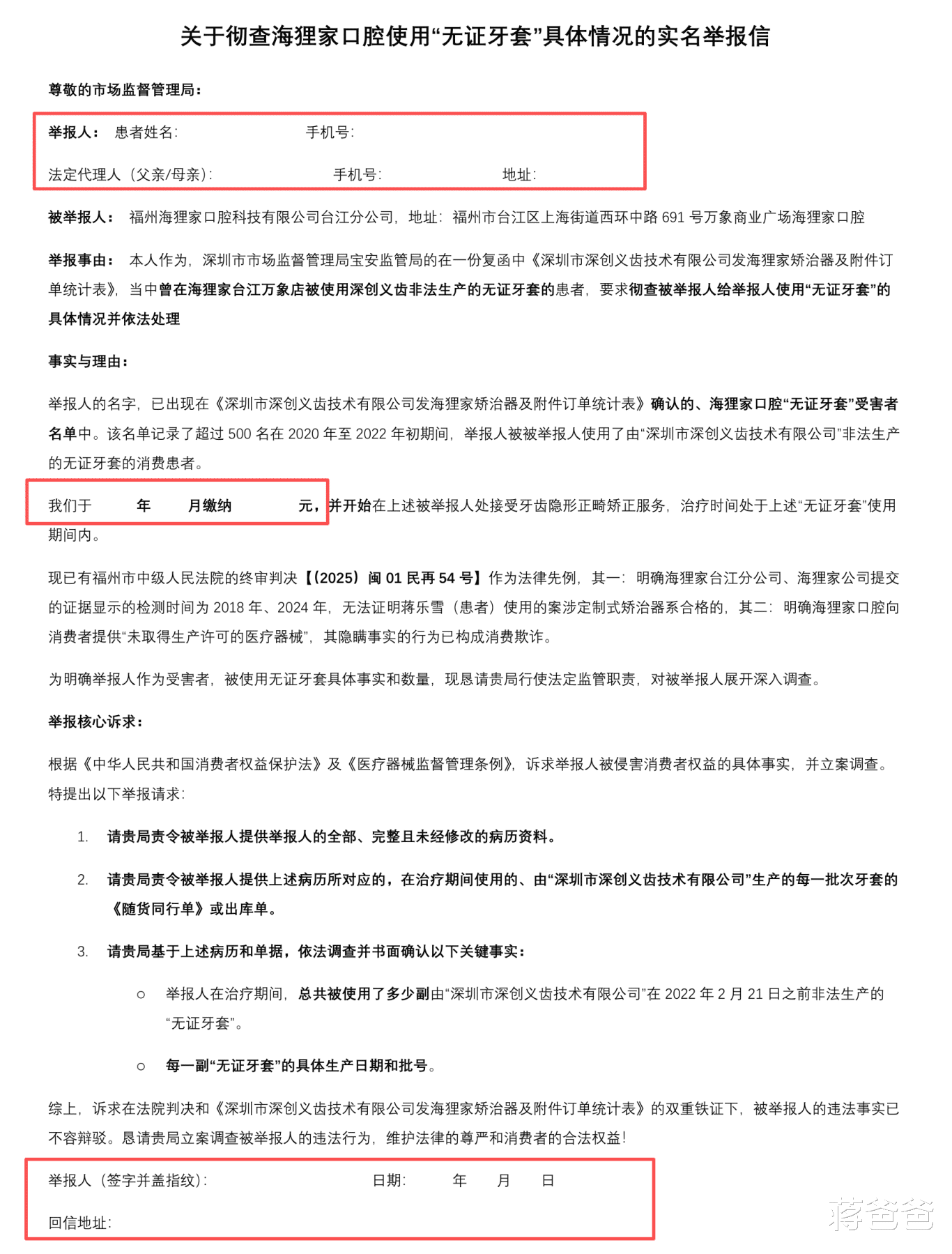 我,作为福州海狸家口腔科技有限公司(以下简称“海狸家口腔”)“无证牙套”消费欺诈事件的受害者家属,同时也是一名持续为广大消费者维权的公民,今日特此公开呼吁并严正要求贵平台:立即下架海狸家口腔所有宣传及团购产品,终止与其一切合作,停止为这家被法院认定欺诈、使用“无证牙套”的黑心企业提供任何线上交易和宣传渠道!