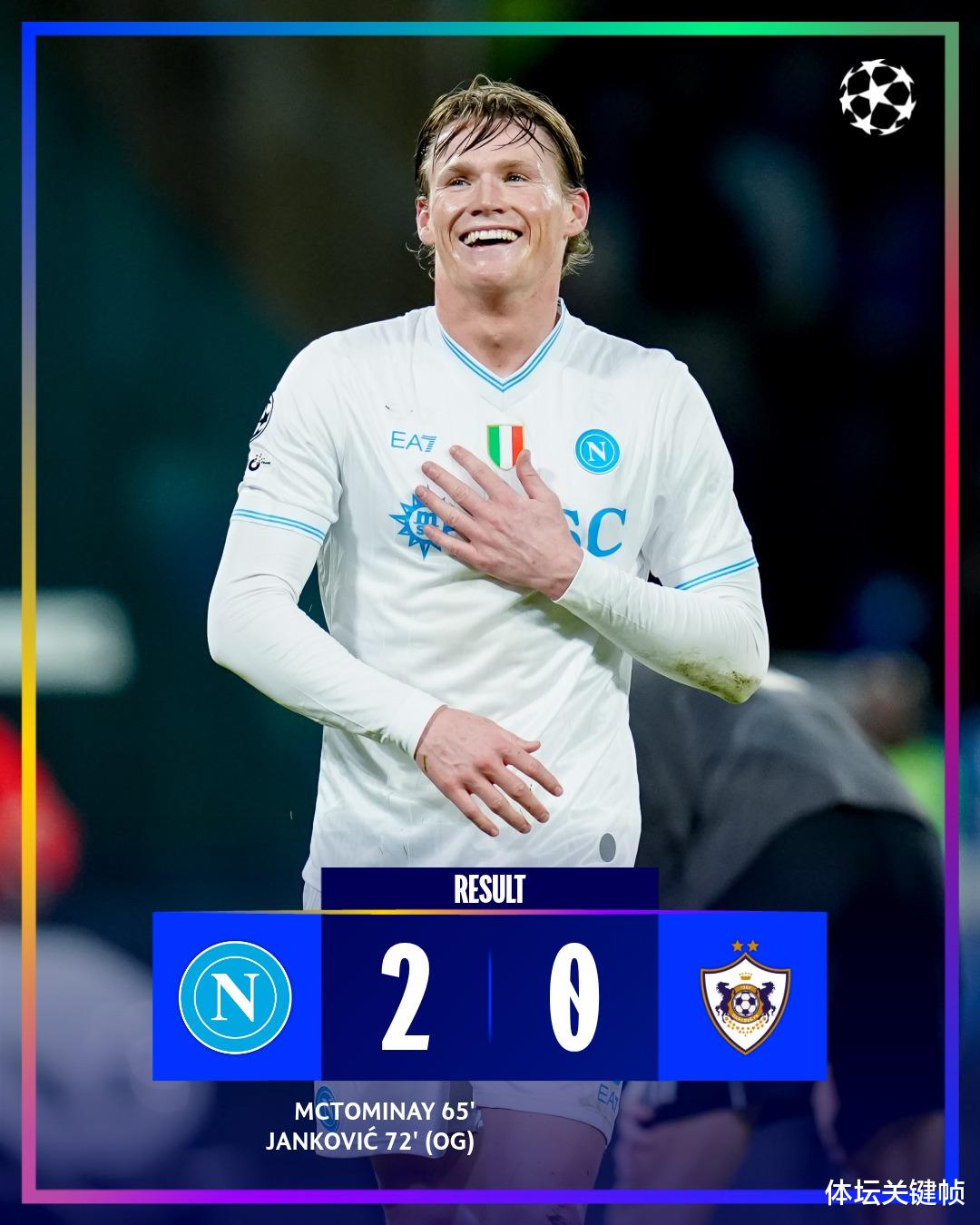 斯科特・麦克托米奈参与了球队的两粒进球,助力那不勒斯斩获本赛季联赛阶段第二场胜利。上半场双方均有精彩射门,卡拉巴赫前锋伊曼纽尔・阿达伊的远射稍稍偏出,戴维・内雷斯的倒钩射门被马特乌什・科哈尔斯基扑出,半场双方 0 - 0 战平。