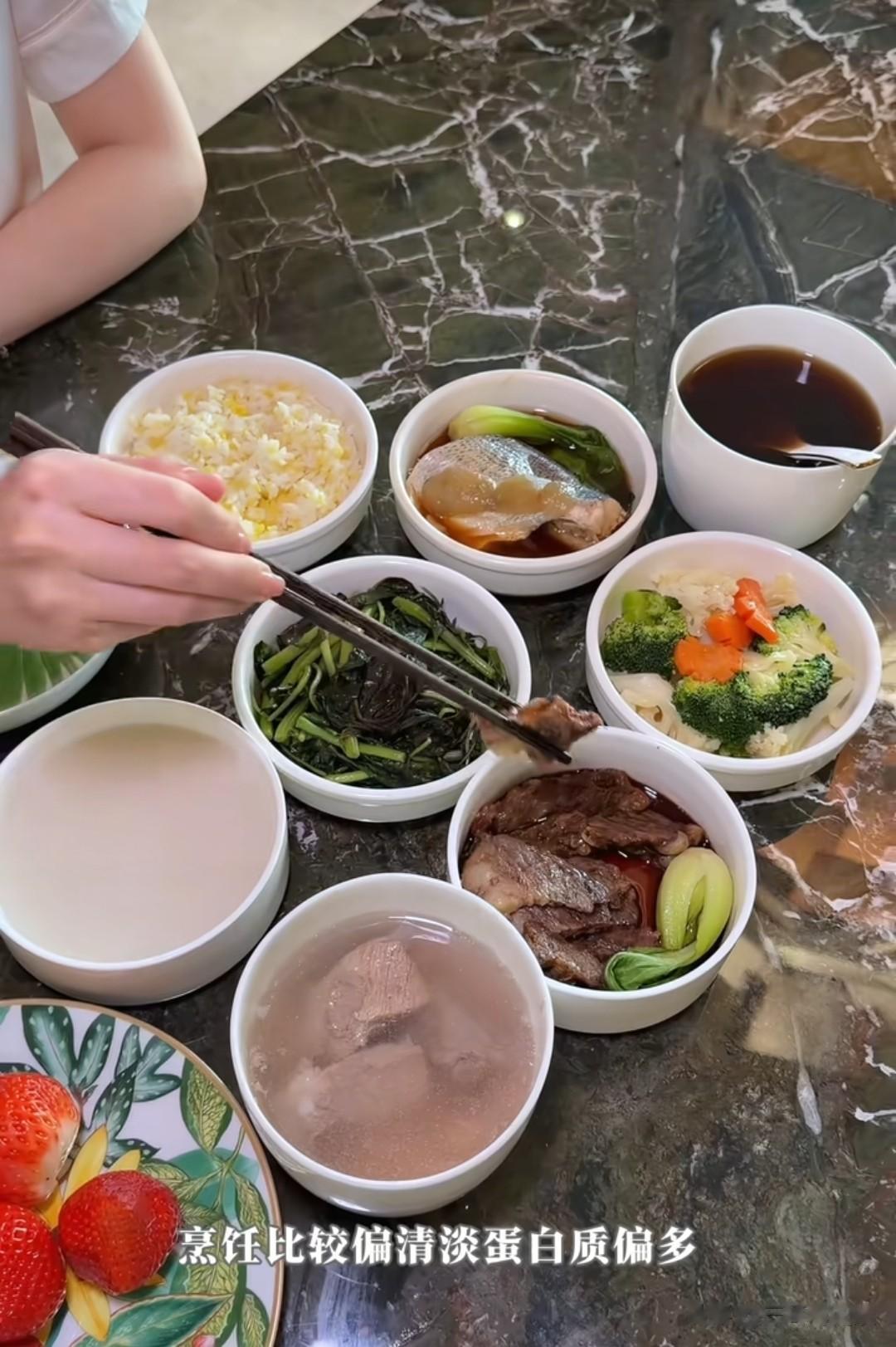 在台湾那边,马筱梅被照顾的很周到,除了有保姆外,她的妈妈也是很会做饭的,所以她起来的第一餐就特别丰盛,大大小小的碗有十来个,荤素搭配很有营养,跟月子餐差不多。