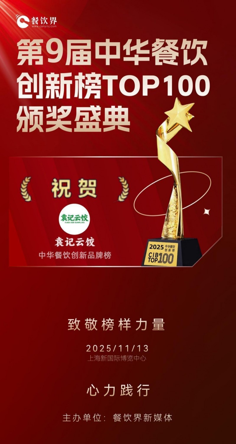 2025年11月13日,上海新国际博览中心见证了餐饮行业的一场盛会——“2025第22届中华餐饮双创论坛”在此盛大举行。在备受瞩目的“第9届中华餐饮创新榜TOP100”颁奖典礼上,袁记云饺凭借卓越的创新实力与出色的市场表现,荣耀登榜,成为餐饮领域创新发展的杰出典范。