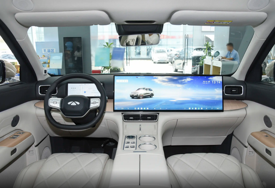 来到前排,一个简约而有科技感的座舱呈现在面前,中控台上直接搭载一块超大尺寸的悬浮大联屏,视觉效果相当不错,只不过当前市面上有太多车型搭载同款屏幕,看多了其实有些审美疲劳。屏幕内集成大量科技功能,在功能性方面不会有什么问题。