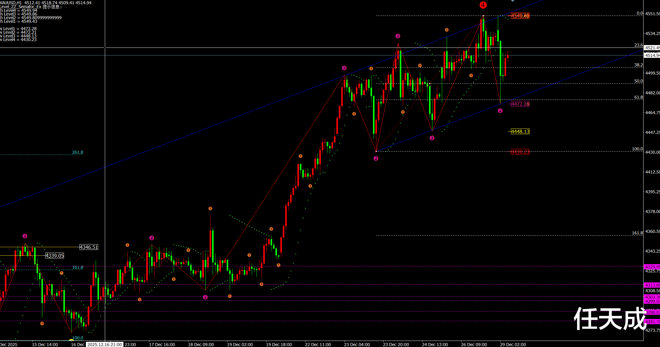 短期4小时看应该不会跌破早间低点,所以目前价格维持在4472-4450区间。那么多单点位就是4478-4492两点了,至于做空位置是4545-47附近。