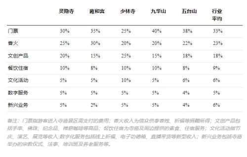 根据久谦中台行业研究的数据,通过对灵隐寺、雍和宫等知名寺庙的数据统计,门票约占总营收20-40%,香火钱和法事活动贡献15-40%,文创产品销售占比逐年提升至10-30%。