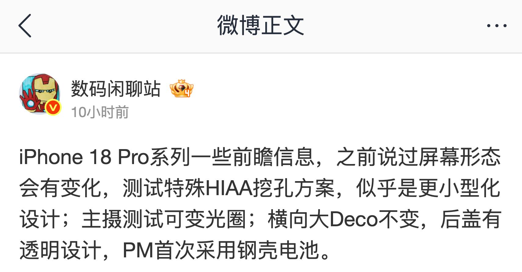 HIAA 技术虽然可以实现屏下镜头,但从目前的消息来看,苹果想要在 iPhone 18 Pro 隐藏的可能只是 Face ID 组件,仍会保留前置镜头的圆形挖孔。不过数码闲聊站在最新的消息中仅表示,采用 HIAA 技术后,iPhone 18 Pro 的「屏幕形态将发生改变」。