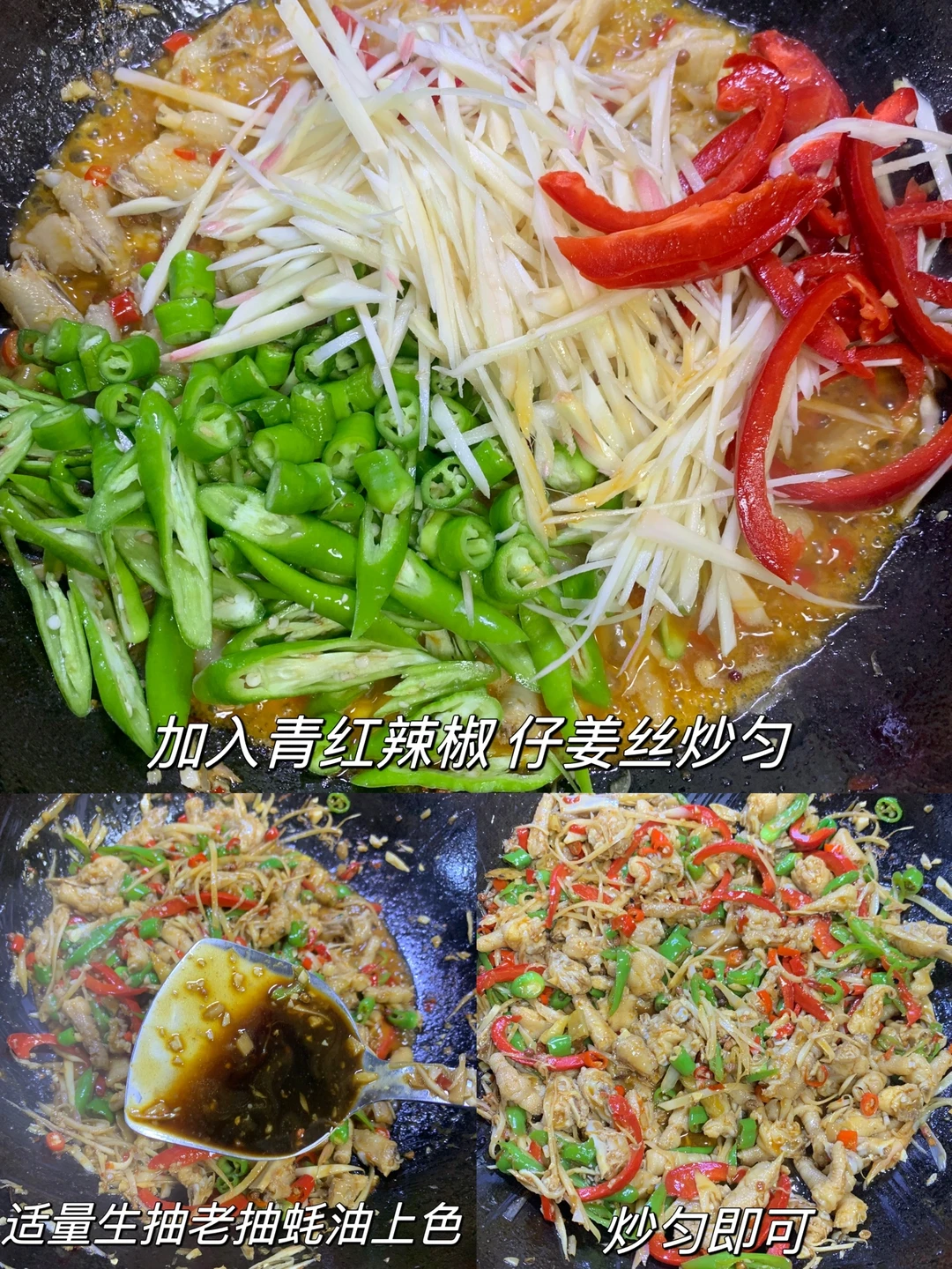 4⃣️倒入仔姜丝、二荆条、甜红椒丝炒至断生,最后加入生抽、老抽、蚝油,翻炒均匀即可
