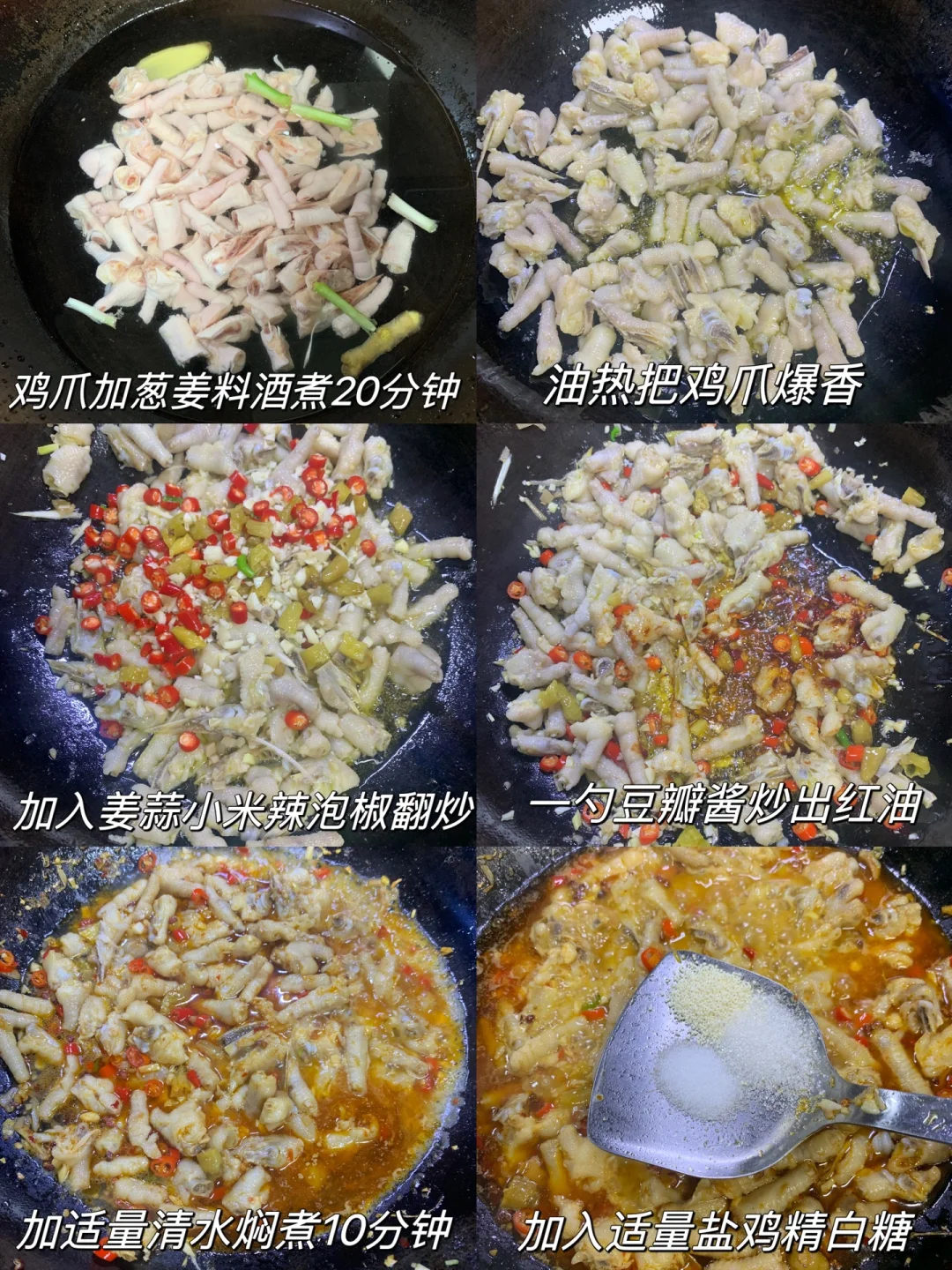 2⃣️锅中烧油,油热倒入鸡爪爆香,加入姜蒜末、泡椒、小米辣、花椒翻炒出香味,再加入一勺豆瓣酱炒出红油