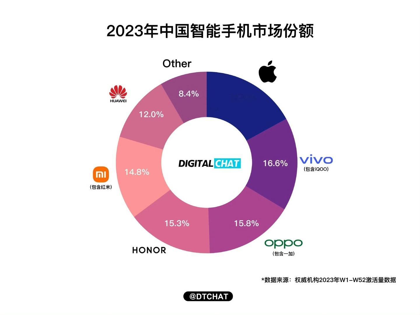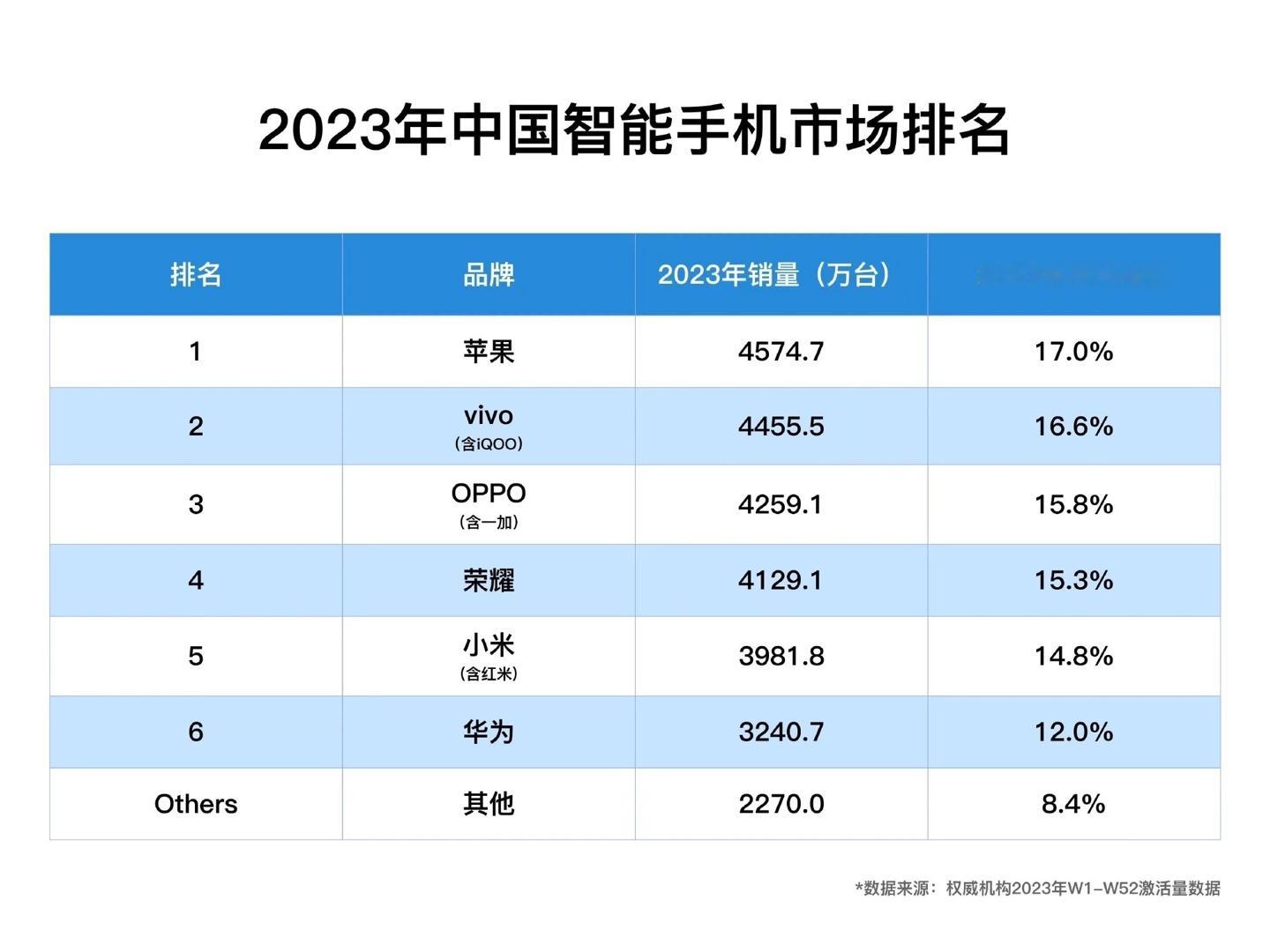 其中全年前五品牌依次为:苹果、vivo、OPPO、荣耀、小米(华为正在快速回归有望进入前五)