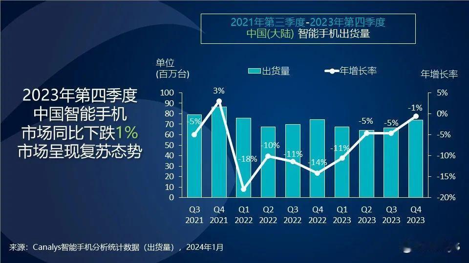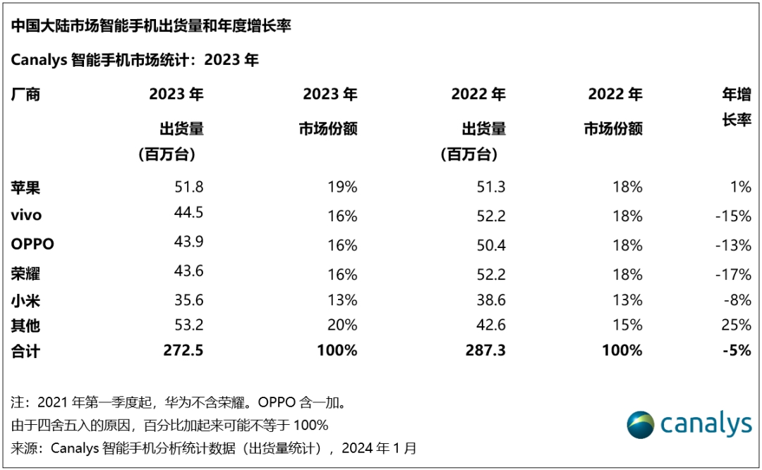 【Canalys公布中国大陆智能手机市场2023全年及Q4季度销量报告】