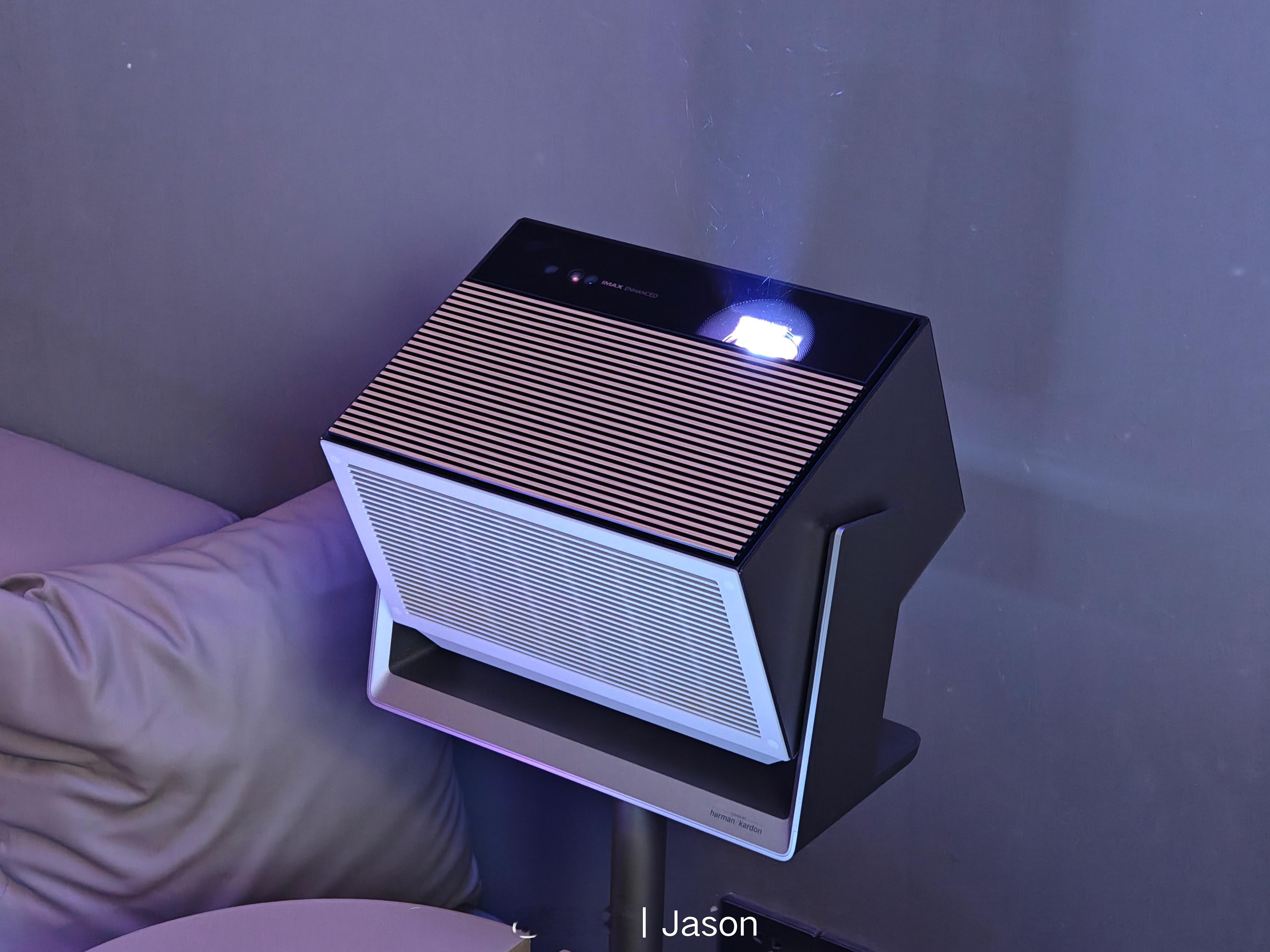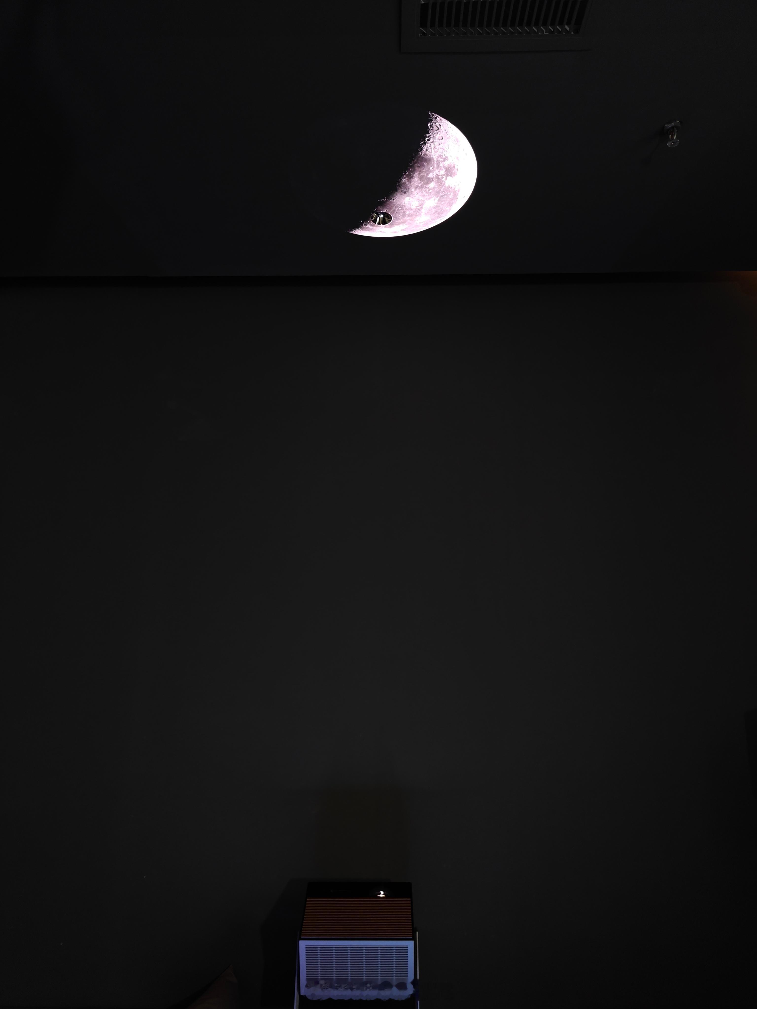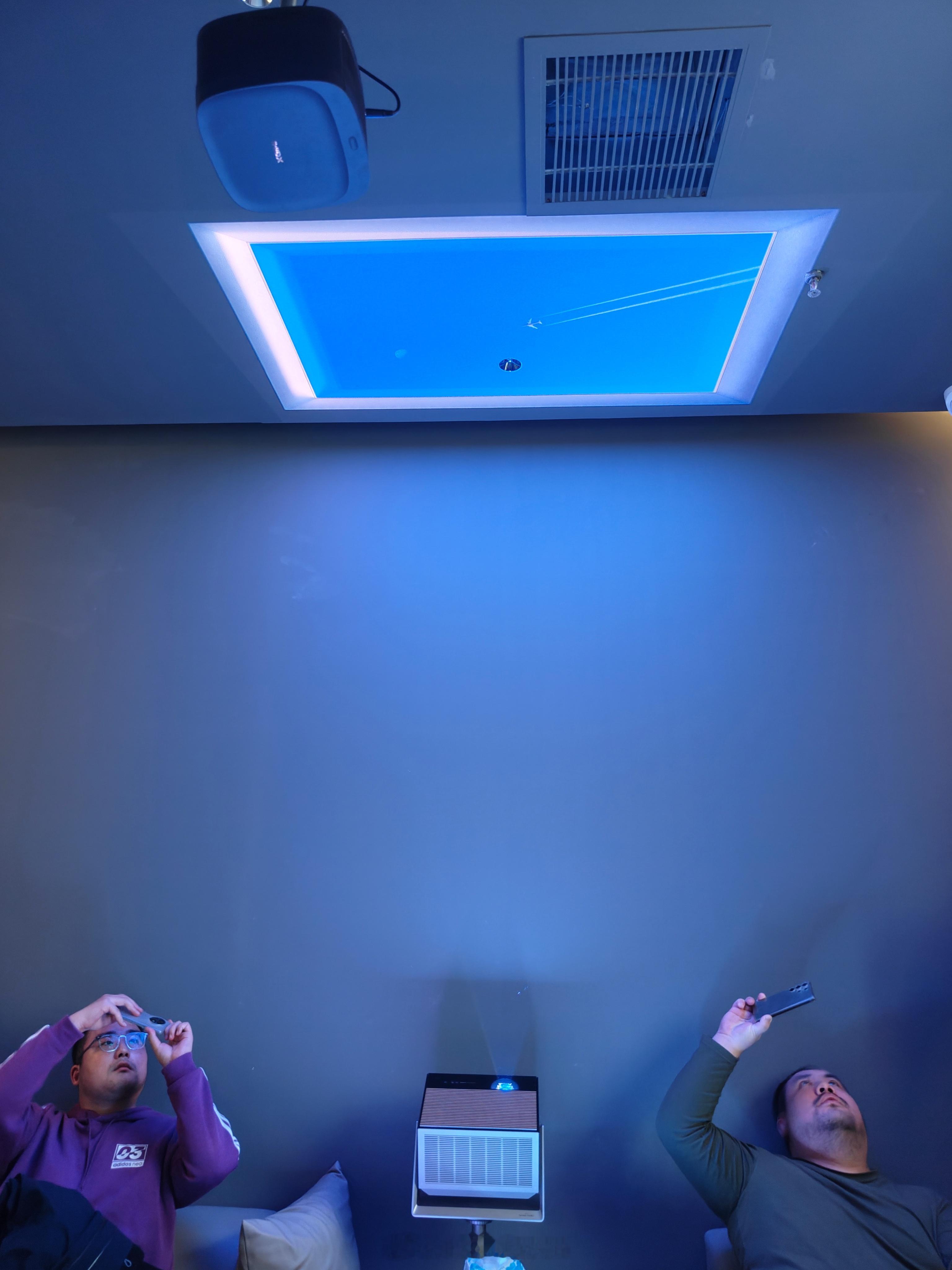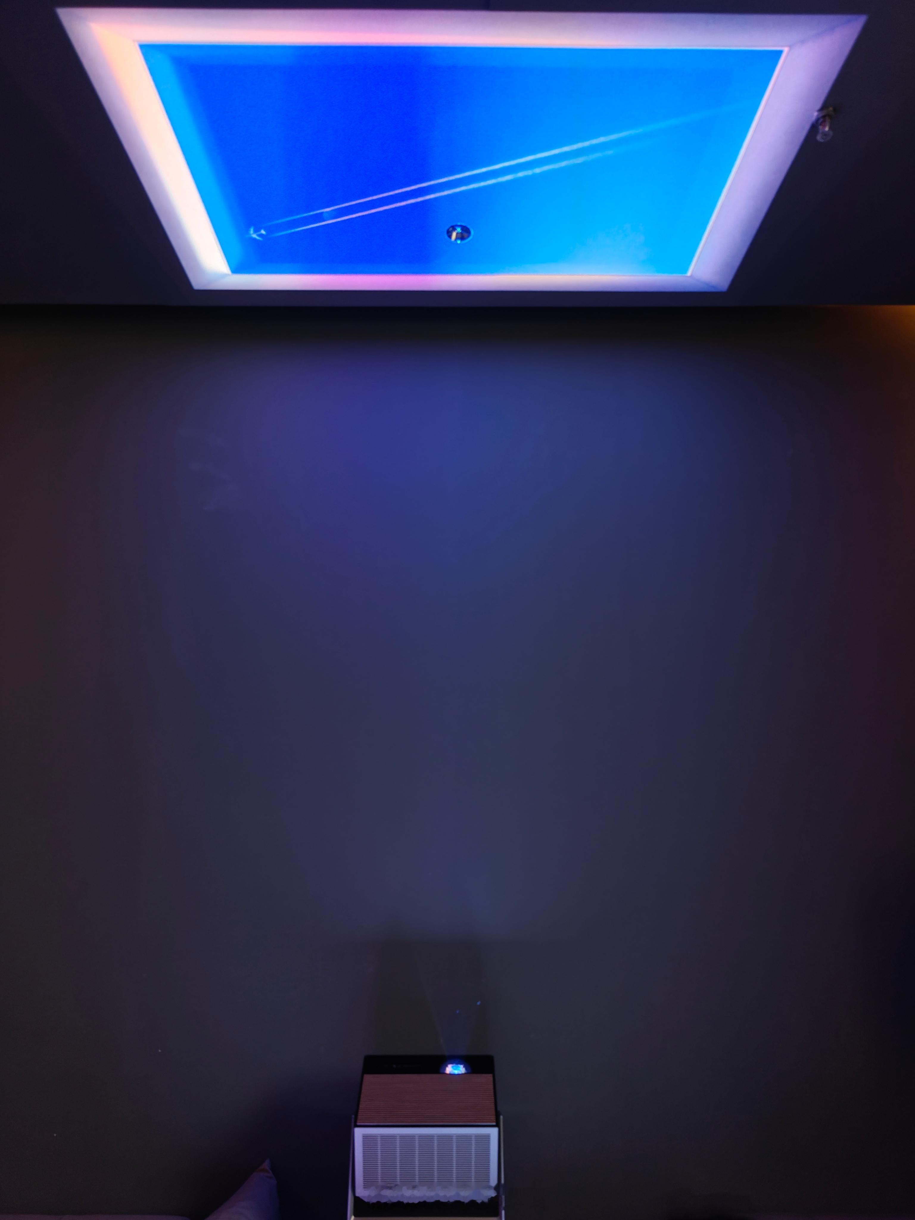 底部的智能支架设计得也很巧妙,不但支持自动调平和自动找幕布功能,而且还可以记住墙面的设置,在不同方位的墙面上自动播放预设内容。设置到天花板投影出来的「天窗」,是我比较喜欢的一个功能。