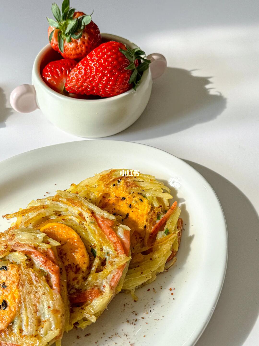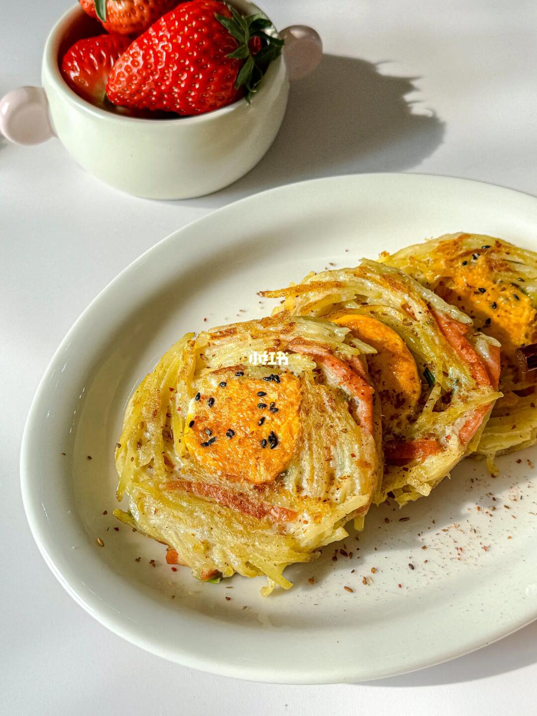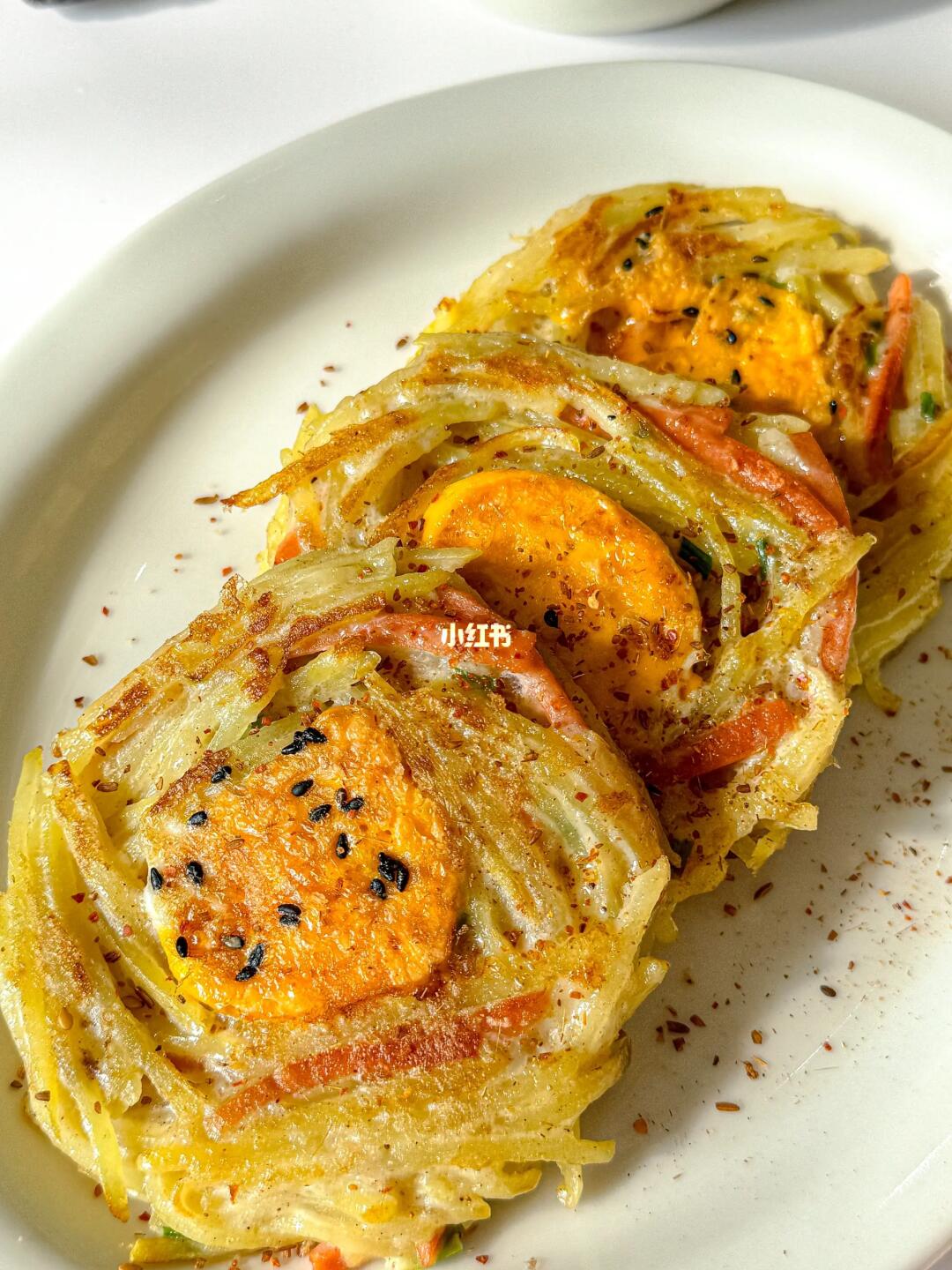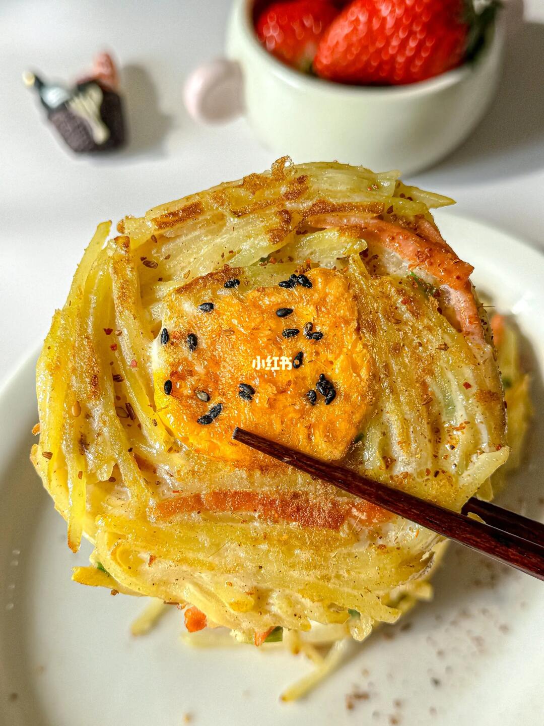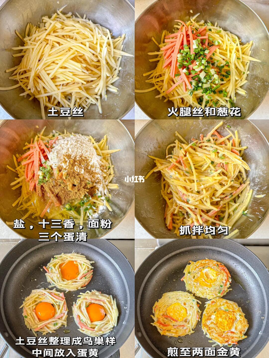 早上不知道吃什么 这个香酥土豆饼,营养又好吃 食材:土豆/火腿/葱花/鸡蛋/面粉 制作: 1️⃣土豆丝➕火腿丝➕葱花➕十三香➕适量盐➕一勺面粉➕三个蛋清,抓拌均匀 2️⃣平底锅中喷油,放土豆丝,整理成鸟巢形状 3️⃣中间放入蛋黄 4️⃣中小火煎至定型,翻面煎到两面金黄 5️⃣出锅撒上烧烤料,或者蘸番茄酱都可以