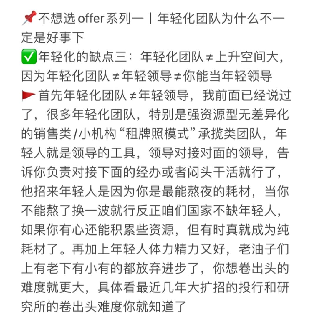 🚩首先年轻化团队≠年轻领导,我前面已经说过了,很多年轻化团队,特别是强资源型无差异化的销售类/小机构“租牌照模式”承揽类团队,年轻人就是领导的工具,领导对接对面的领导,告诉你负责对接下面的经办或者闷头干活就行了,他招来年轻人是因为你是最能熬夜的耗材,当你不能熬了换一波就行反正咱们国家不缺年轻人,如果你有心还能积累些资源,但有时真就成为纯耗材了。再加上年轻人体力精力又好,老油子们上有老下有小有的都放弃进步了,你想卷出头的难度就更大,具体看最近几年大扩招的投行和研究所的卷出头难度你就知道了