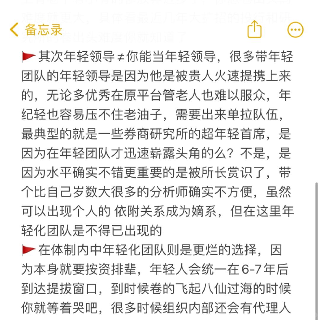 🚩其次年轻领导≠你能当年轻领导,很多带年轻团队的年轻领导是因为他是被贵人火速提携上来的,无论多优秀在原平台管老人也难以服众,年纪轻也容易压不住老油子,需要出来单拉队伍,最典型的就是一些券商研究所的超年轻首席,是因为在年轻团队才迅速崭露头角的么?不是,是因为水平确实不错更重要的是被所长赏识了,带个比自己岁数大很多的分析师确实不方便,虽然可以出现个人的 依附关系成为嫡系,但在这里年轻化团队是不得已出现的