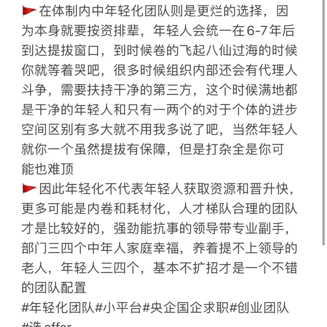 🚩在体制内中年轻化团队则是更烂的选择,因为本身就要按资排辈,年轻人会统一在6-7年后到达提拔窗口,到时候卷的飞起八仙过海的时候你就等着哭吧,很多时候组织内部还会有代理人斗争,需要扶持干净的第三方,这个时候满地都是干净的年轻人和只有一两个的对于个体的进步空间区别有多大就不用我多说了吧,当然年轻人就你一个虽然提拔有保障,但是打杂全是你可能也难顶