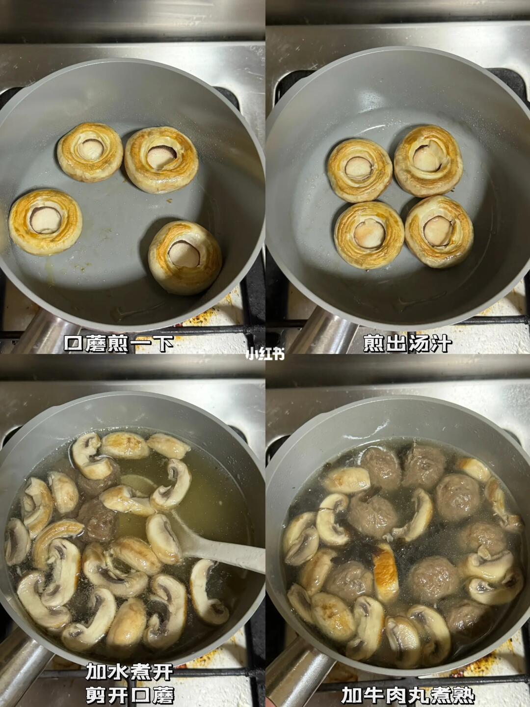 天冷了,就喜欢喝点暖暖的汤 这个汤又简单又好喝 🗒️食材:口蘑/牛肉丸/香菜/紫菜 👩🏻🍳制作: 1️⃣口蘑煎至两面金黄 2️⃣翻过来碗口朝上煎出汤汁 3️⃣加水煮开放入牛肉丸煮熟,口蘑剪碎 4️⃣加盐和白胡椒 出锅撒上香菜,非常鲜美