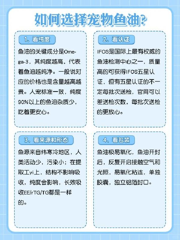 新手铲屎官这些事千万注意‼ 猫猫狗狗掉毛、容易生病!焦虑的铲屎官们,一定要仔细看这篇! Omega-3是一种优质的不饱和脂肪酸,宠物身体无法自主产生,主要有DHA和EPA组成。 动物缺乏omega-3,很容易毛发干燥粗糙、无法维持良好视力、消化道血管出现问题等......。 作为功课型铲屎官👩🏻,我总结了以下选择鱼油的注意事项,希望可以帮到各位❤ ⬇先看一下鱼油的纯度和鱼种来源地 ⭐纯度越高,吸收率和脂质代谢率也越高,鱼油的品质会越好。 ⭐鱼油原料来自于高纬寒冷地区的会更好,那里的人类活动少,污染小,深海鱼体内omega3含量高。 ⬇看有效成分的含量 ⭐鱼油主要成分Omega-3脂肪酸,欧米茄3脂肪酸的主要成分是EPA和DHA,优选Omega-3含量过千的鱼油。 ⬇看认证的安全性 ⭐IFOS是国际上最有权威的鱼油检测中心之一,质量高的可获得IFOS五星认证,但有五星认证的不一定每批次送检,每批次送检的更放心。 ⬇看包装 鱼油极易氧化,瓶装的鱼油开封后,反复开启接触空气和光照,易氧化粘连,优选单独胶囊。 🌈希望所有的毛孩子都健康快乐!我家也前后试过很多款,目前在吃的金凯撒,效果还不错,各位可以按需选择哦~