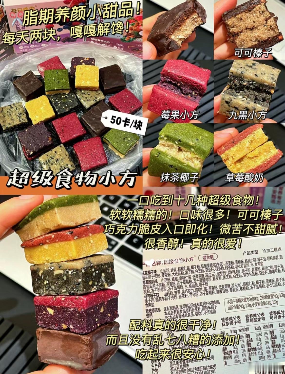 ▪️超级食物小方【50卡/块、高蛋白、高纤维】一口能吃到十几种超级食物!软软糯糯的,口味选择很多!可可榛子我的蕞爱,巧克力脆皮入口即化,不甜腻很香醇!配料很干净,没有乱⑦⑧糟的添加!