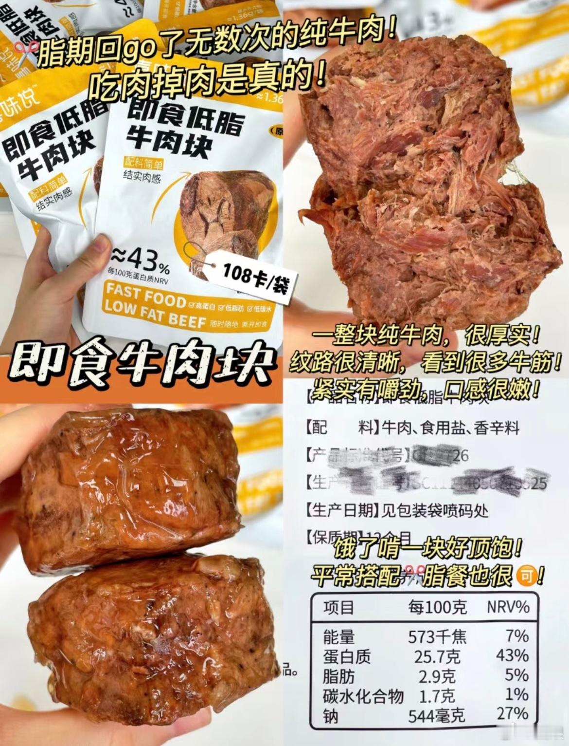 配料巨千净的即食牛肉块!一整块纯牛肉,很厚实!纹路清晰,还能看到很多牛筋!口感紧实有嚼劲,工作饿了啃一块好顶饱,平常搭配火脂餐也很何,吃肉掉肉!