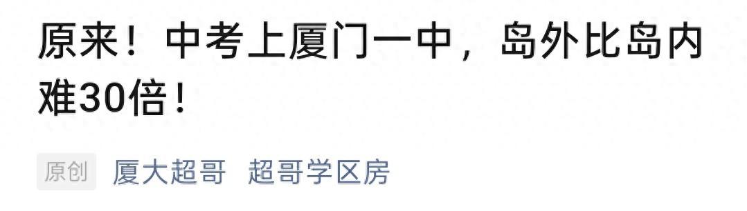 一、厦门岛内外中考的基本情况是:岛内是“培优”,岛外是“保底”。岛内外中考分数线差距较大,这是事实。岛内更多集中优秀生源。代表厦门顶尖高中的岛内一中和双十,70%的定向名额,全部给的是岛内(思湖片区)学校,岛外孩子为0。不仅如此,岛外孩子想考一中和双十,必须非常拔尖。有人总结,岛外考岛内一双的难度,是岛内的30倍。毕竟分数线比岛内录取线高,又没有定向生名额。