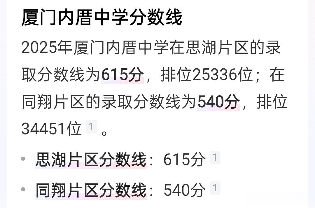 但与此同时,岛内对成绩不佳的孩子,又很不友好。2025年厦门排名靠后的公办高中内厝中学,在思湖片区录取分数线为615分,排名25336位,差不多得在全市排名前50%;在同翔片区分数线却只有540分,排位34451位,全市前70%即可。换句话说,岛外高中做好“五保户兜底”工作,让成绩不佳的孩子有公办高中读。