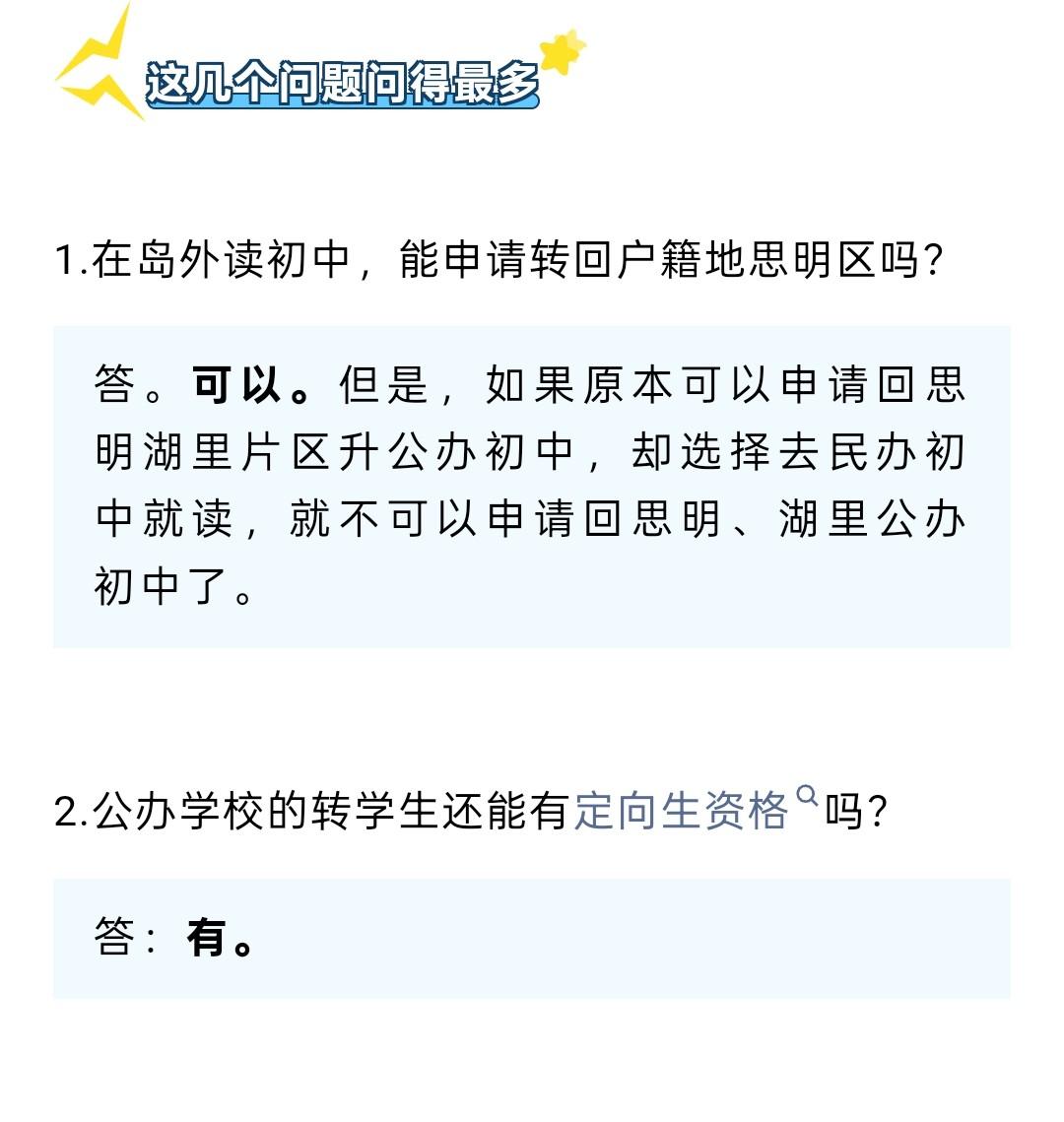 学爸了解到,现在的情况好像有调整。简单说:在初中,同一个片区内转学,是会失去定向生资格;但不同片区转,还能保留定向生资格。比如初二时候,思明的初中转到湖里的初中,就没有定向生资格;但思明的初中转到同安、翔安、海沧、集美的初中,还是有定向生资格。反过来也是一样,海集同翔的初中转到思明或湖里的初中,也能有定向资格。这个规定是不是与定向生初衷违背,具体什么时候执行的——说实话,学爸也不清楚,大家都这么说,权威媒体“厦门招考”也确认了。