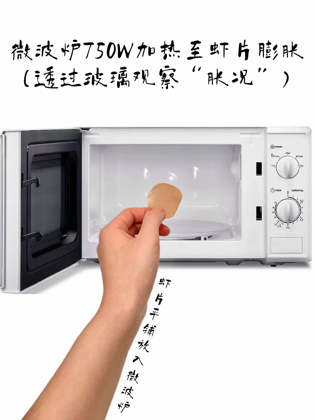 多少次想吃却没买都是被做法劝退? 这回再也不用担心吃虾片麻烦啦! 👉都是心得 虾片🉑每次多放几片, 🉐平铺在微波炉里, 这样受热均匀。 每片虾片加热时间🉑能不同, 膨胀好的虾片🉐先取出不然会糊, 其余的继续加热。 如果一片虾片只膨胀了一半, 给它换个位置、转个方向或翻个身, 再继续加热即🉑。 微波炉温度在750W上下调整即🉑, 但温度不宜过高,否则容易糊。 ⚠️注意安全 由于不同的微波炉功率可能存在差异 所以加热时间🈚️法明确 还需靠观察虾片的膨胀情况确定好了没有 过程中🉐注意安全