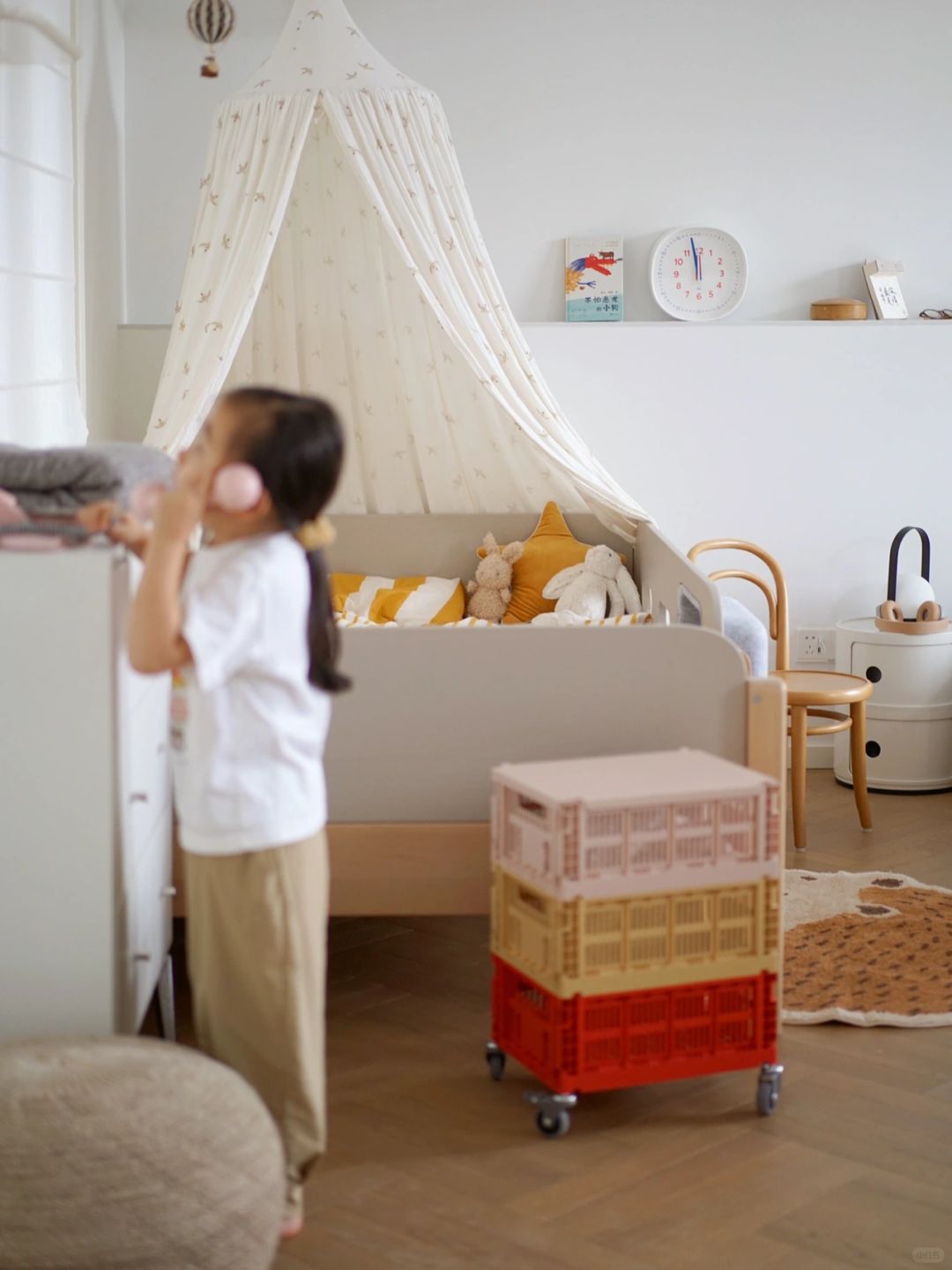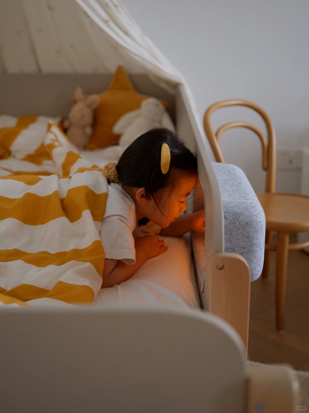 我本来一直以儿童床比较小,妈妈不能陪你睡觉为借口,我们各睡各的,但是好像小朋友越大反而越粘人,这种长大后粘着我的时光,我觉得且睡且珍惜❤️于是我们换了pupupula这个1.2m*2m的四边围板床🛏️,好啦,偶尔我就可以从大床跑去小床搂着你睡觉啦❤️