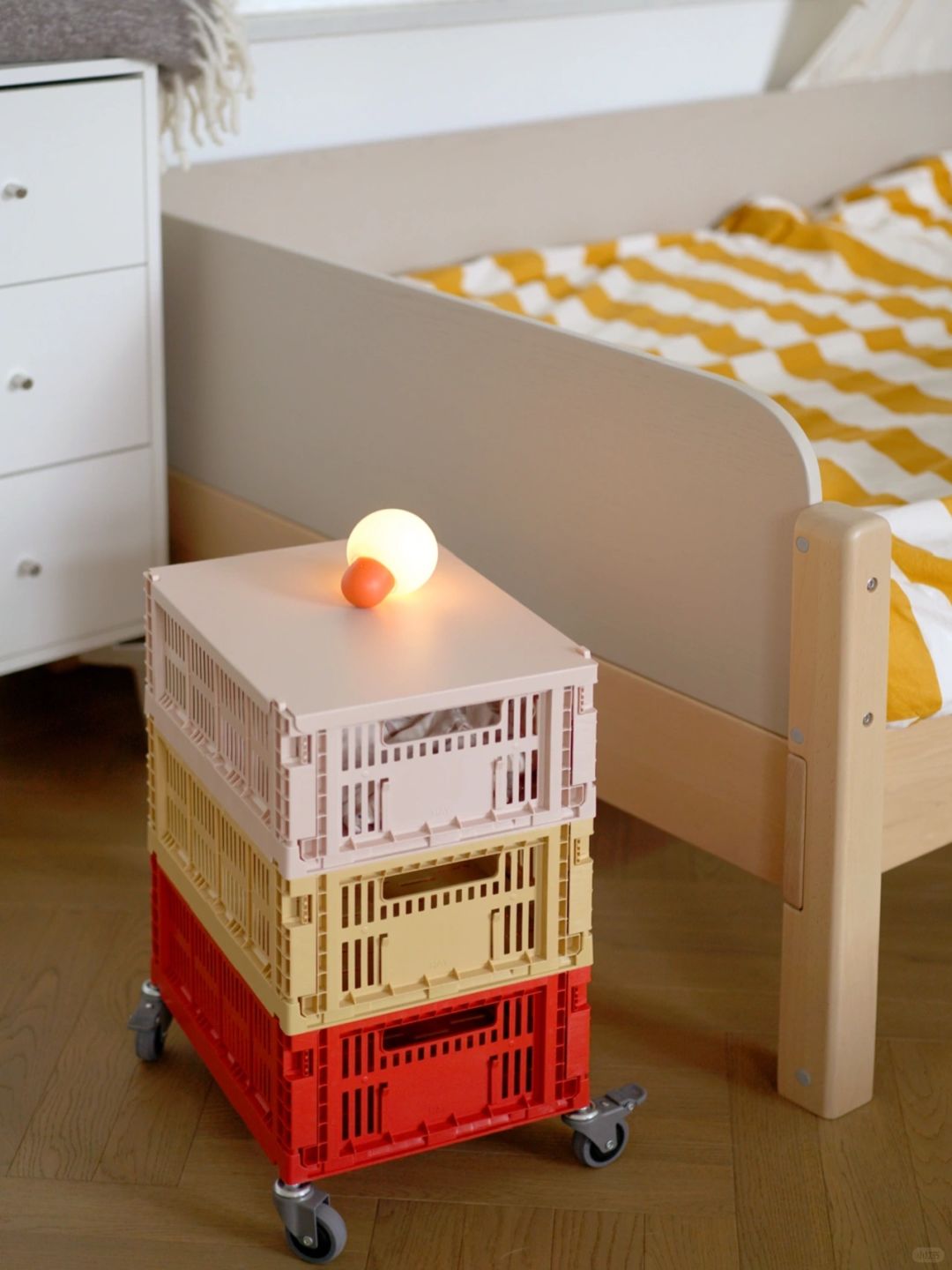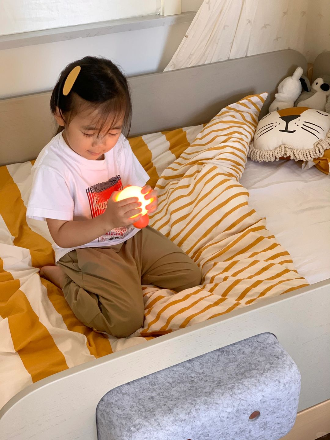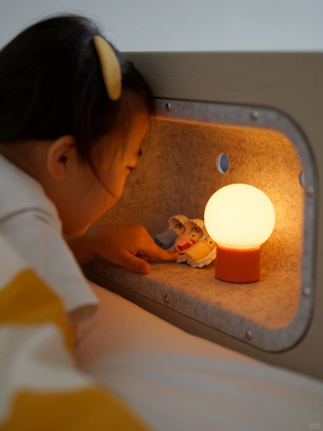 床的围栏上嵌了小小一个储物空间,可以当成床头柜来用,女儿塞了过家家的玩具,倒是玩出了娃娃屋的感觉。还有一个轻拍即亮的小灯泡💡,光线很柔和,方便小朋友起夜。