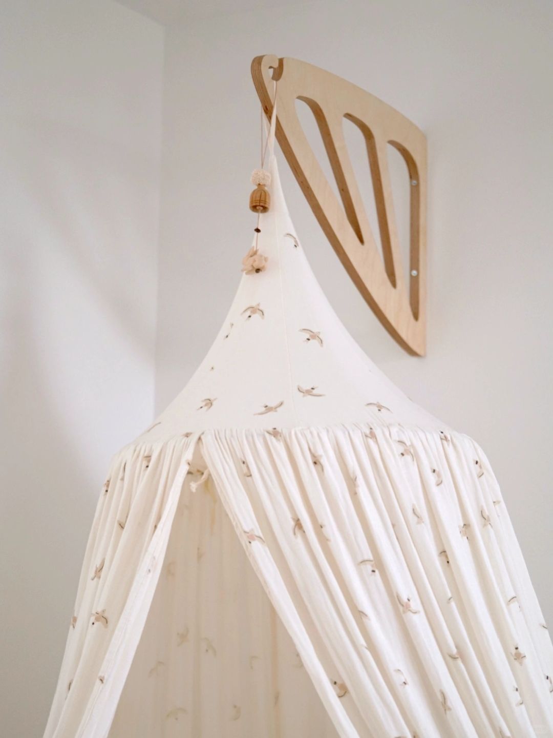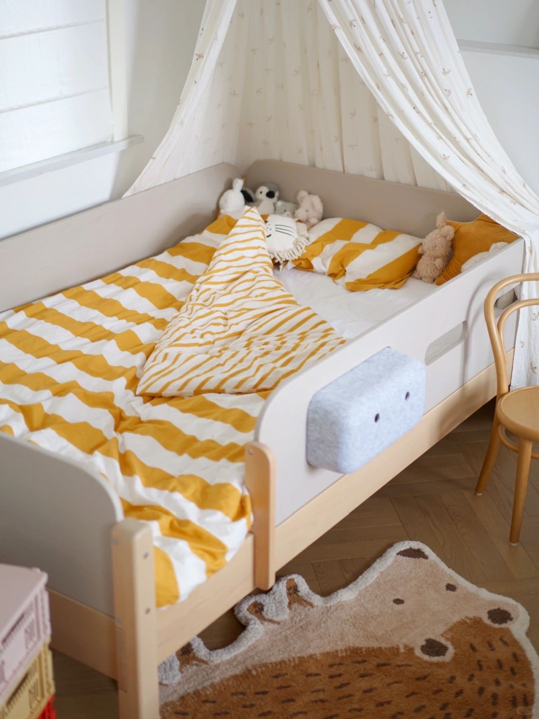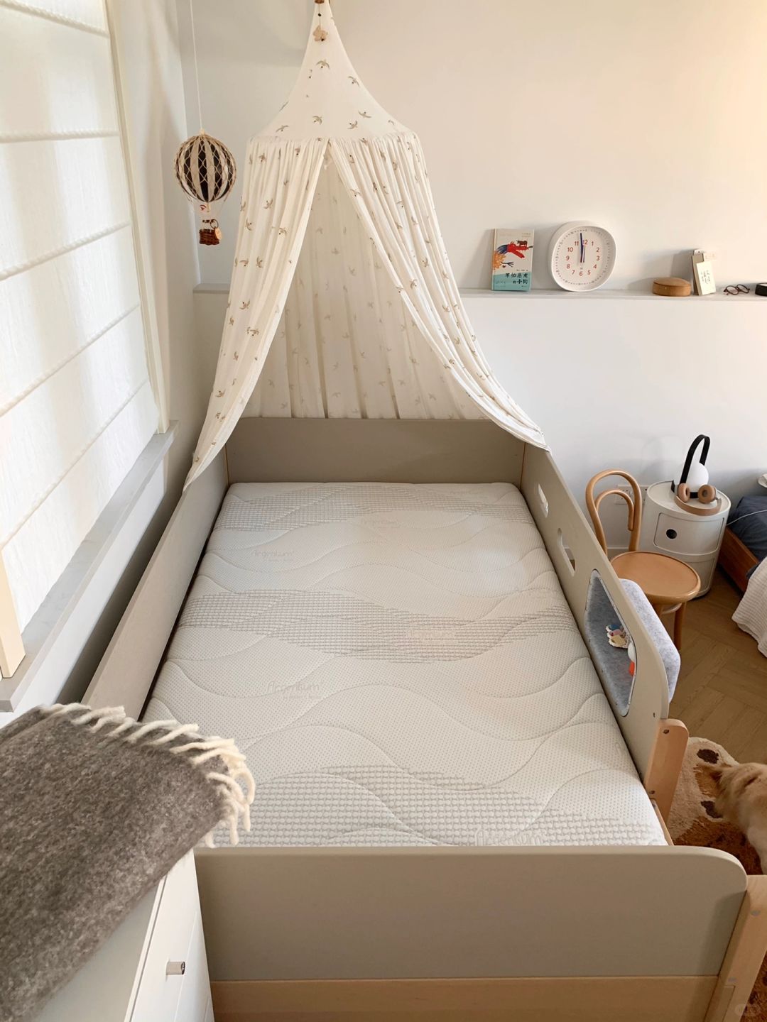新床的这一圈围板比以前更高,虽然床大了不少,但躺在里面依然是被包裹的感觉,加上我们顶上装了帷幔,像睡在小帐篷里一样,我没那么快睡着,在隔壁床上刷📱的光线也不会影响到她。等女儿再长大一点,就拆掉两侧围板变成一张适合大朋友使用的单人床。