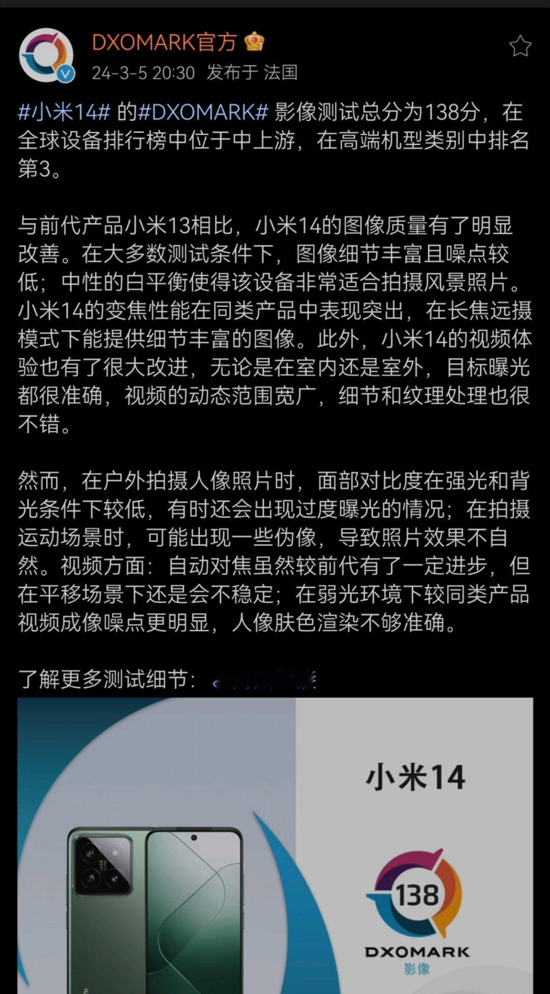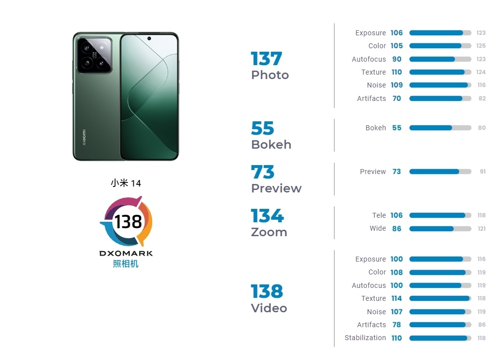 DXOMARK公布小米14标准版屏幕及影像测试成绩