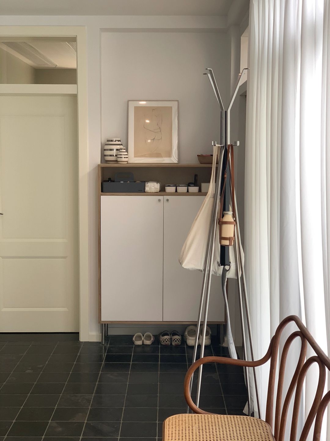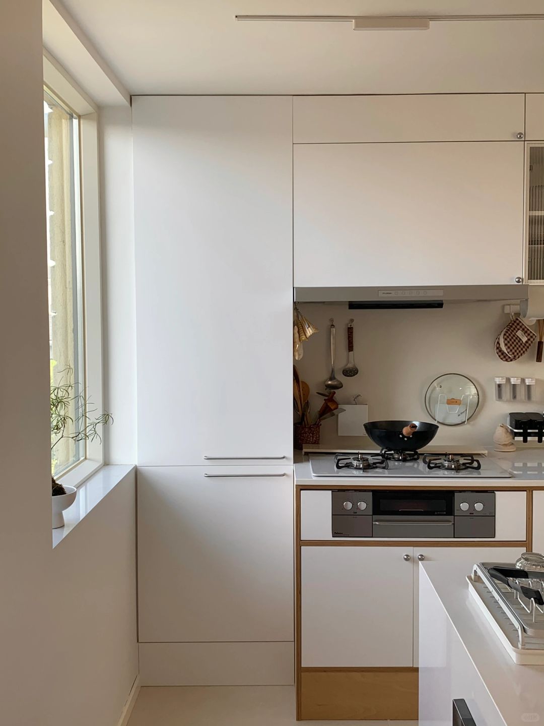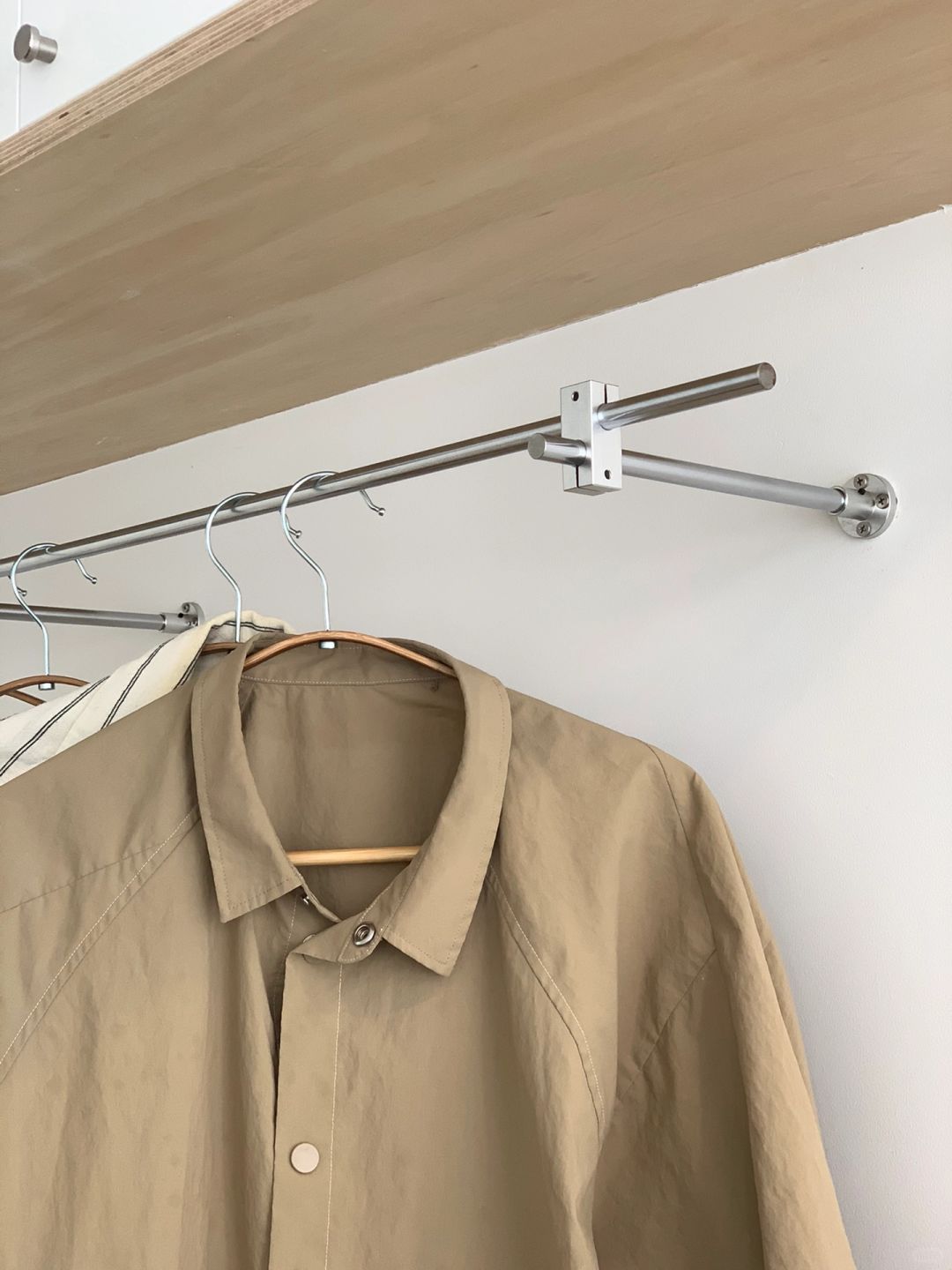 昨天家属帮我把玄关的挂衣架也装好了,这个区域准确的说是玄关的补充,旁边是楼梯,由此上楼才是我家客餐厅,穿了一次没洗的衣服就挂在这,预感秋冬会挂满,朋友来的话,外套和包也能丢在这里。 整套不锈钢的杆子和配件100+r。 顺便分享我家其他区域的不锈钢,细数还不少,餐边柜的台面,餐椅的腿,厨房的灶头,包括我们家很多灯、餐具锅子也都是不锈钢的居多。