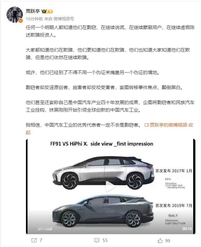 贾跃亭提起诉讼并再次炮轰高合汽车:“明眼人都知道他们在剽窃、在说谎,在继续蒙蔽用户、在继续虚假陈述欺骗投资人”。