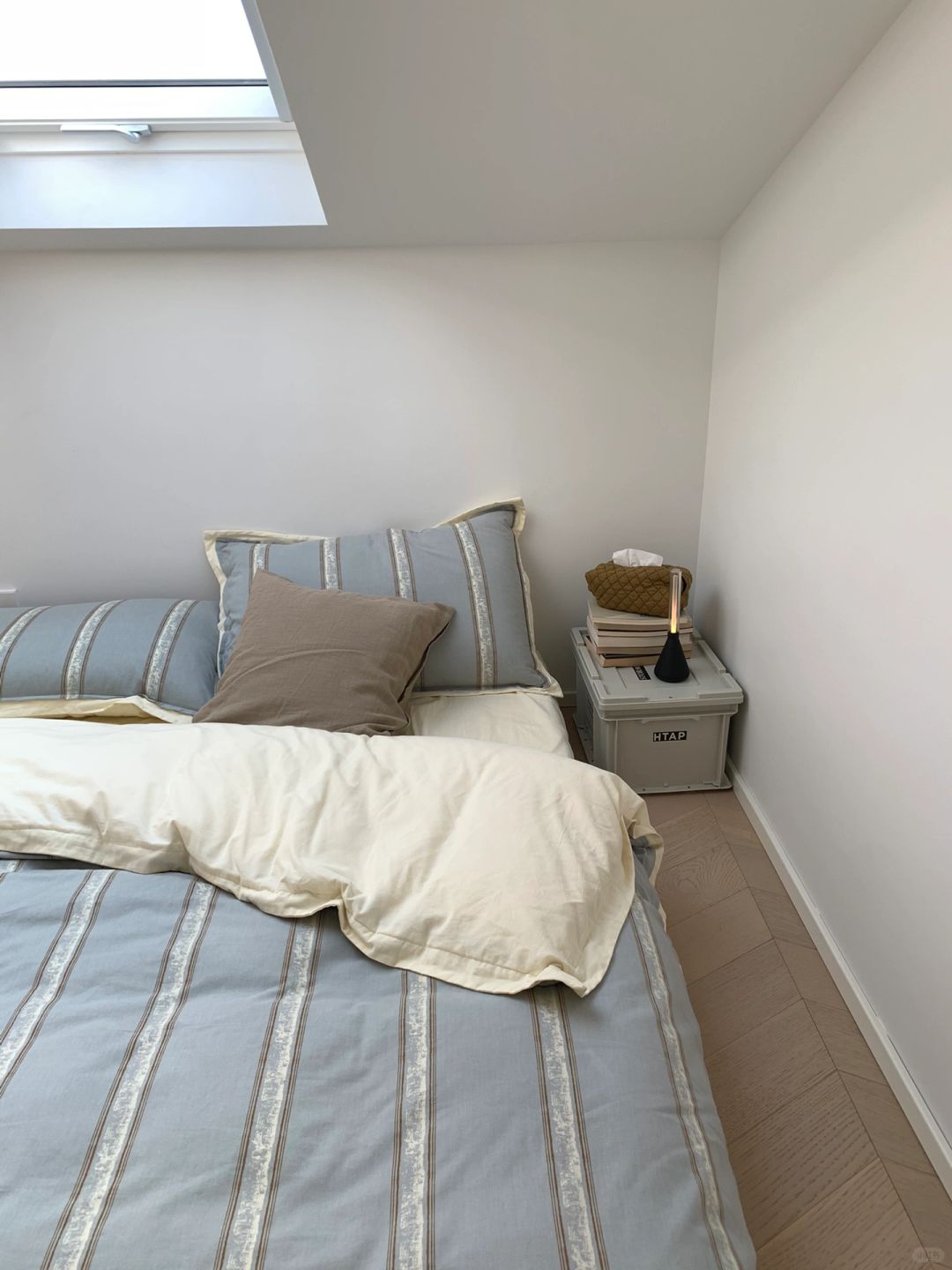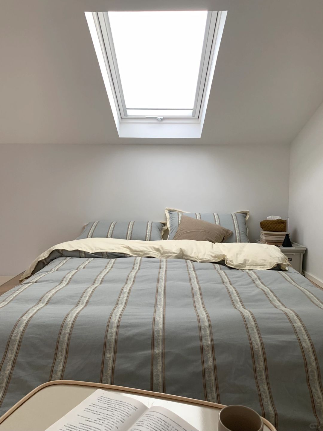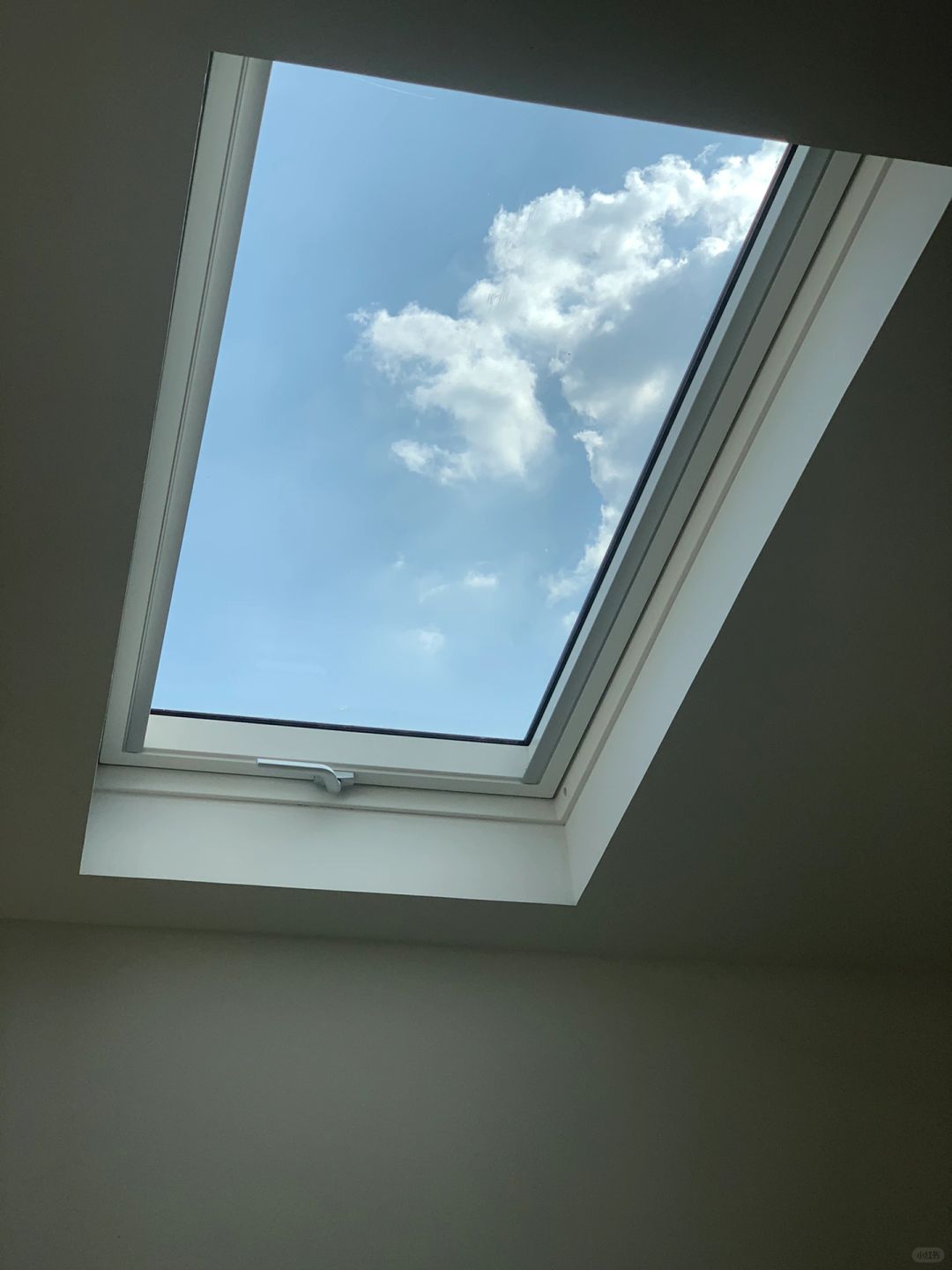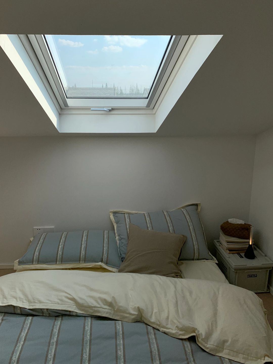 趁着出太阳🌞,来阁楼晒晒快发霉的自己,朝南的小天窗真的可以晒足一整天,感觉今天卧室颜色和蓝天好搭💙💛