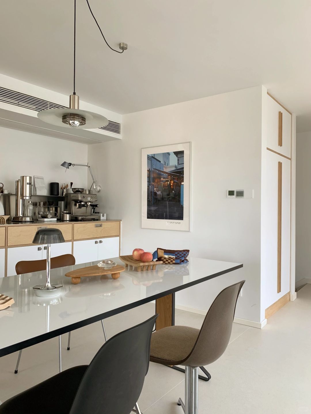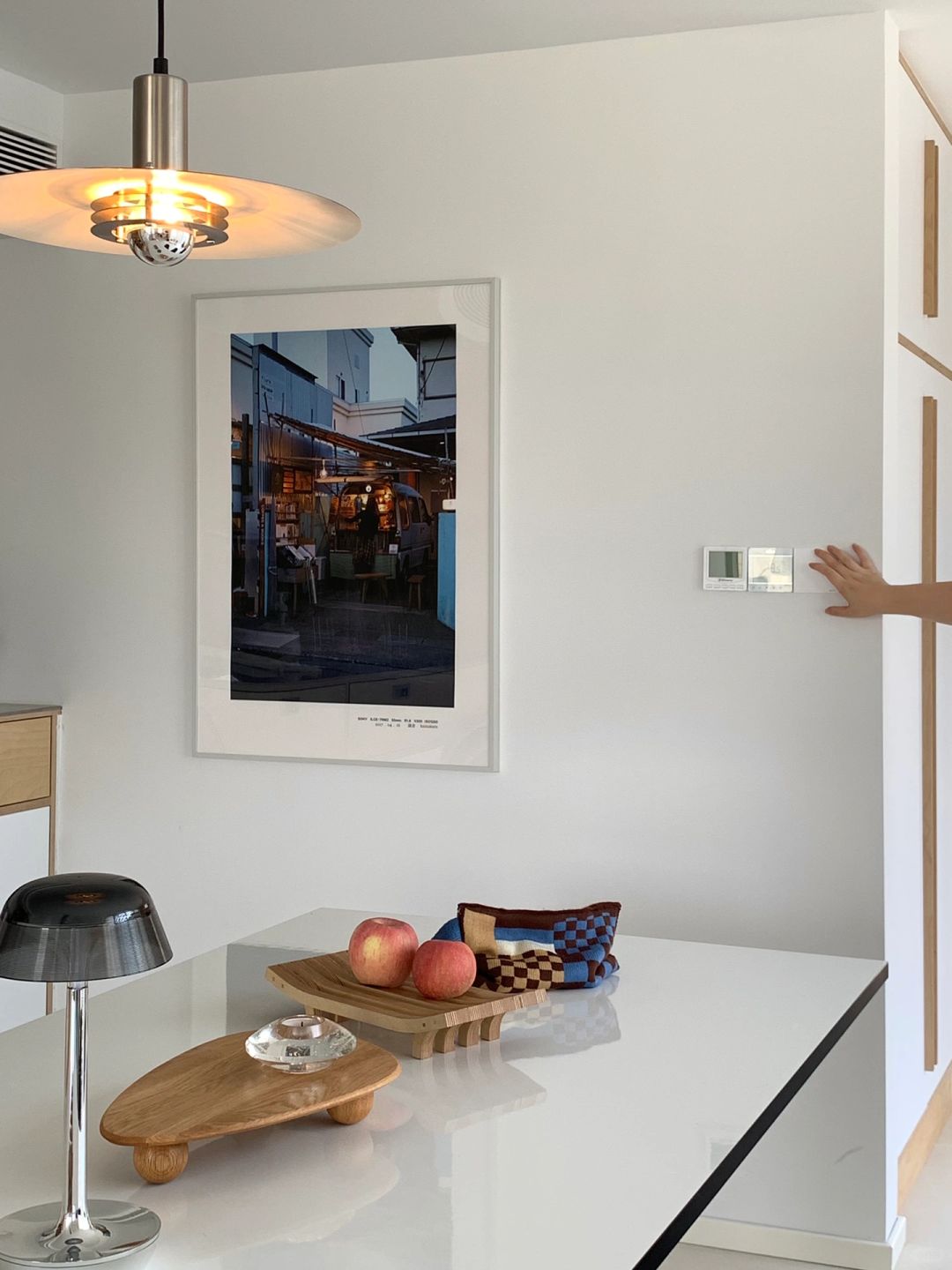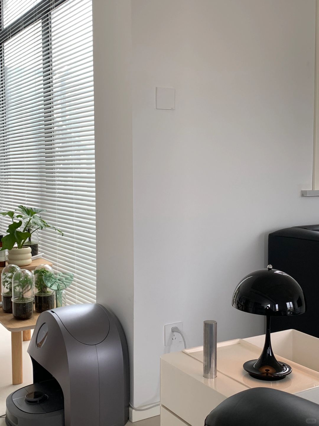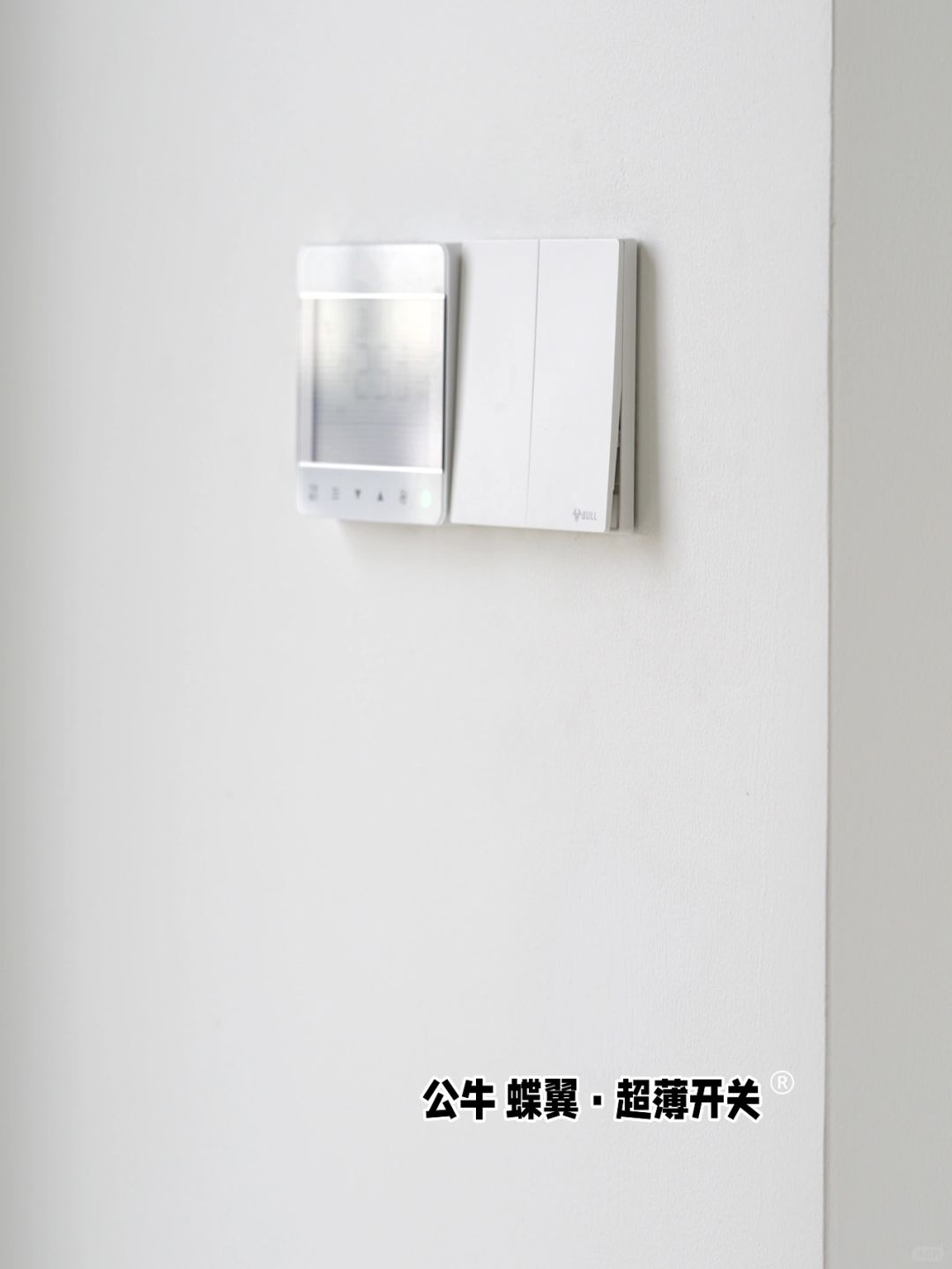 当然是造型尽量极简,但是方寸间的化简是非常难的,我们家的是刘雯同款的公牛蝶翼超薄开关,面板厚度只有6.4mm,除了体型上的超薄,开关侧面的摆角角度也很小,只有2°,比传统开关小60%!所以在体积上的优势,它才能不是一个显眼包!凑近看,质感和墙面也能融为一体,乳胶漆墙面搭配磨砂哑光质感真的很绝,像我家珐琅板搭配的就是亮面的,但白色需要色彩尽可能接近,会更贴合些。