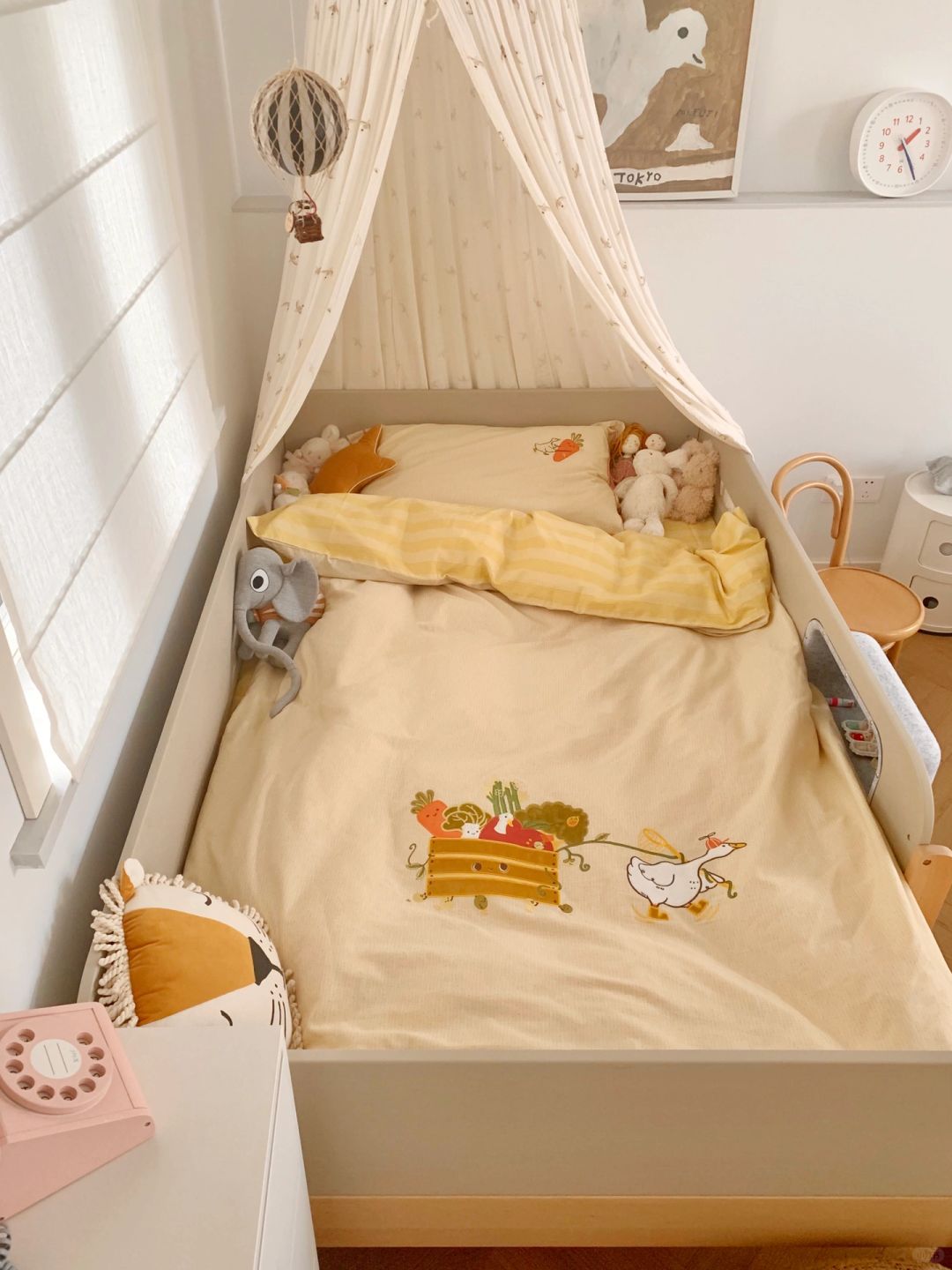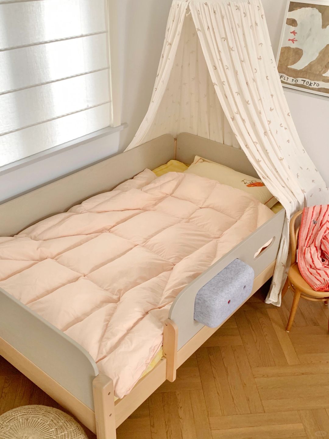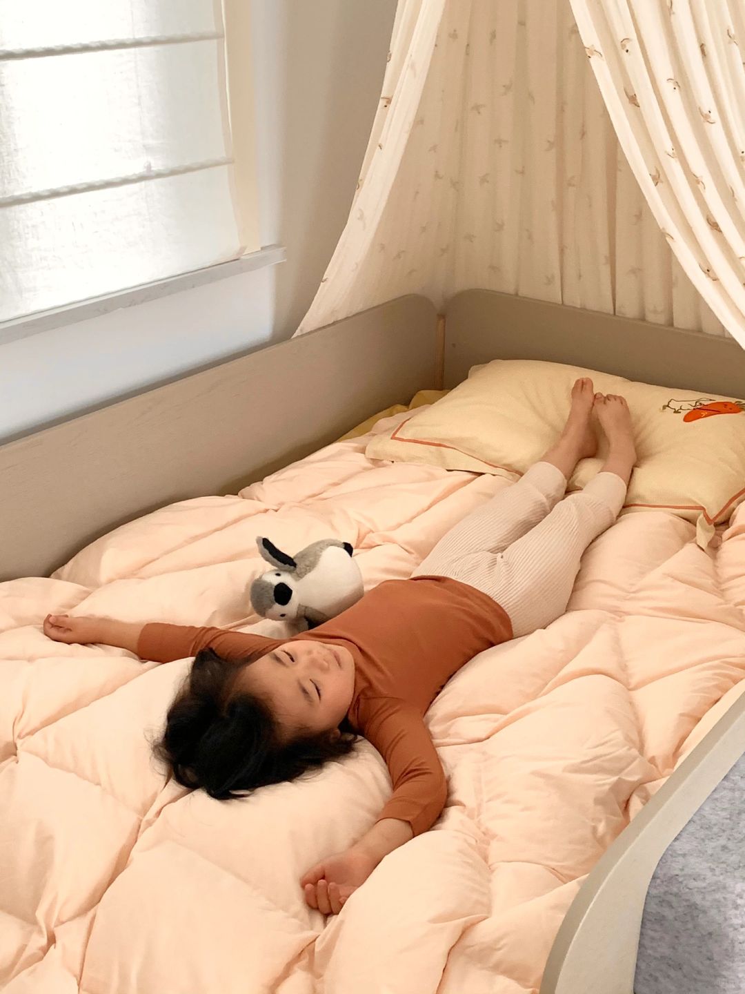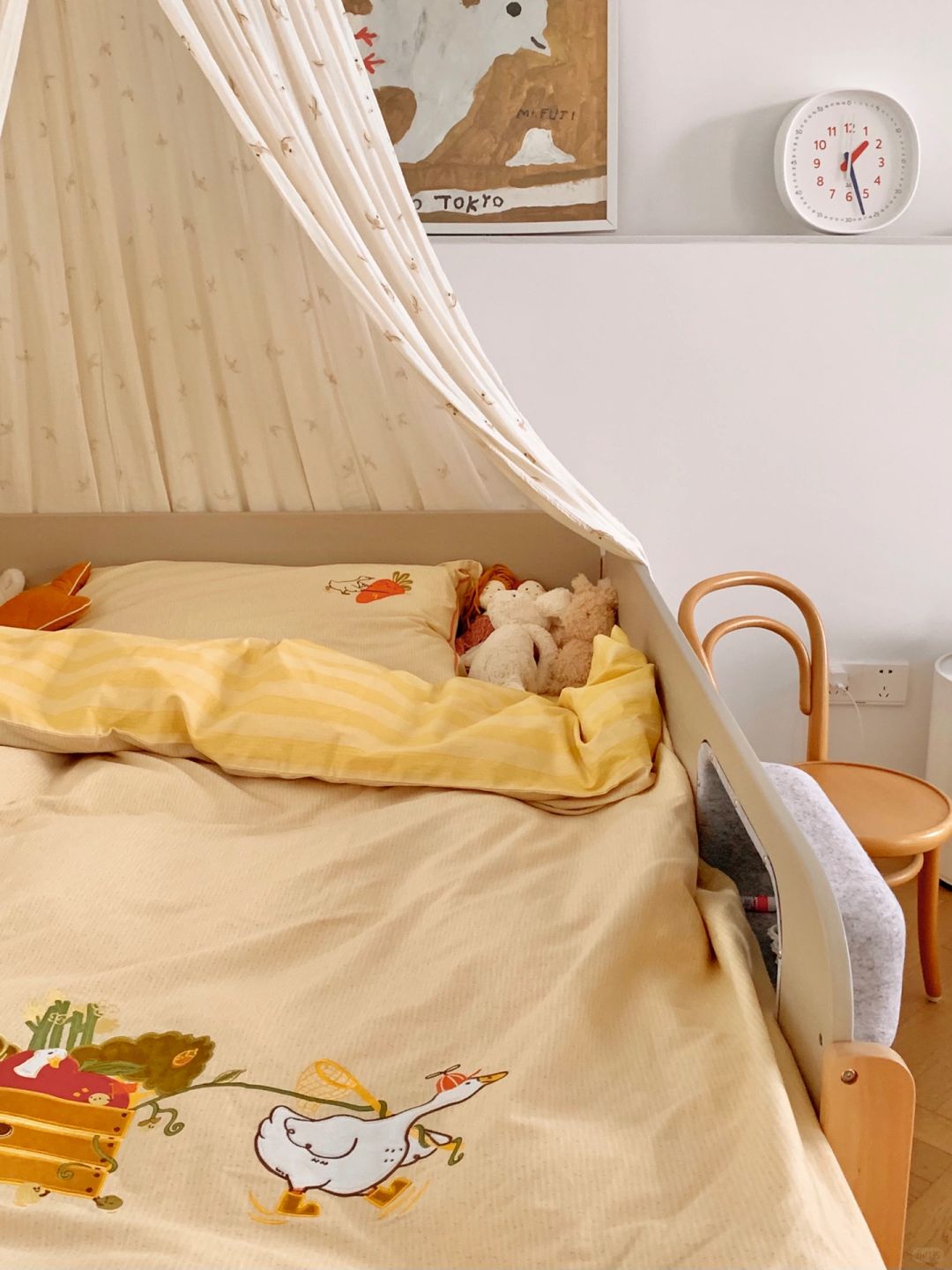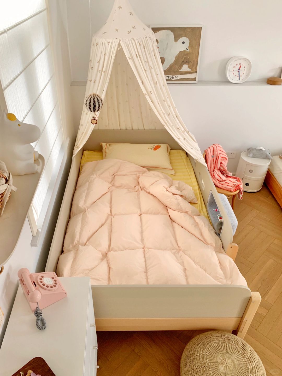 上海已经体感入冬,夜里温度只有个位数,女儿的同学们都开始咳嗽流鼻涕,问下来大家都一样,踢被子。 所以我们家也在入冬前,给女儿换了更大尺寸的盖被,我们家的儿童床是120*200cm的,被子选了罗莱儿童鹅绒被的150*215cm,套件也是他家的,磨毛+鹅绒,主打一个:再怎么打转都转不出来,四周不钻风,虽然听起来有点好笑,但效果很好,真的没有流鼻涕。 分享下挑选儿童床和床品的心得: 1⃣️床的尺寸 120cm宽度的床虽然比较大,但是因为更大更长的被子,才能让小朋友翻身的时候不露出后背,不露出小脚,所以我还是今年给女儿换了这个尺寸的儿童床,身高接近120cm的话,基本也就不会在床里打转了,150*215cm规格的单人被,真的可以扛住小朋友各种大动作。为什么不用小床+大被子的组合呢?因为他们真的不喜欢被子压在身体下面,更喜欢舒展的四肢,所以大床确实是空间足够情况下的首选。 2⃣️被芯的挑选 我们现在这条被芯,是罗莱的罗小羽儿童鹅绒被,侧面看是加厚的,蓬松度高,你可以在家里用挂烫机做实验,贴着被子,在另一侧你能感受到强烈的挂烫机的暖风,好的鹅绒被不仅保暖性好,透气也好,所以刚入睡的时候不会闷出汗,导致孩子掀开被子睡,后半夜着凉。 而且这款被芯鹅绒的清洁度高,标签上也能清楚看到是A类标准,比很多儿童服装的标准都高了,反正我这个鼻炎患者贴着闻也不会打喷嚏。 更加让我笃定要选它的理由是,它有分区填充,在手臂两侧和脚部这三边,被子的绗缝是斜向下的,更贴合小朋友的睡姿,这样不容易拱起来漏风。 3⃣️被套的选择 冬天真的首选磨毛,但是找舒服透气的磨毛是有难度的,很多被套用下来的感觉反而是不透气,闷汗,我们家的全棉磨毛三件套也是在罗莱选的,它的保暖性很好,体感可以升高6℃,初次使用的时候就感觉被套里面很干净,不像别的被子会有飞絮,它的脱毛做得很好,不易起球,这样也就不用一两年就更换了。 舒适过冬,真的是每一个南方人的梦想,希望这篇种草还不算晚,给小朋友换一床被子,温暖地等待开春吧。