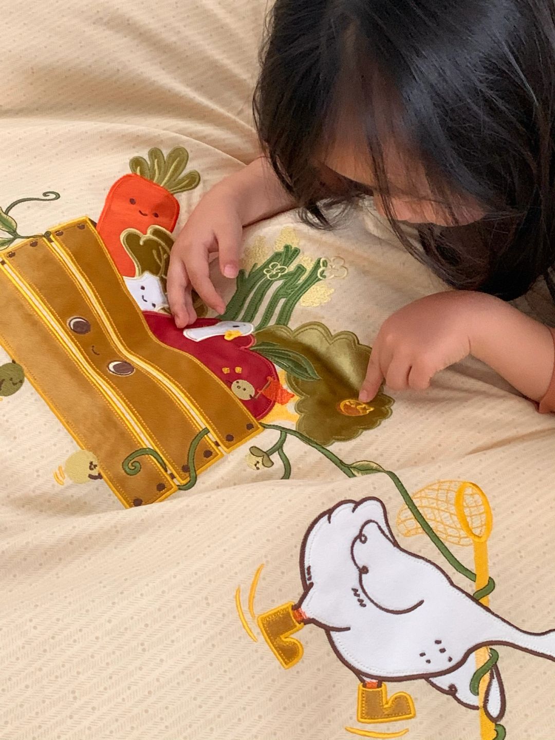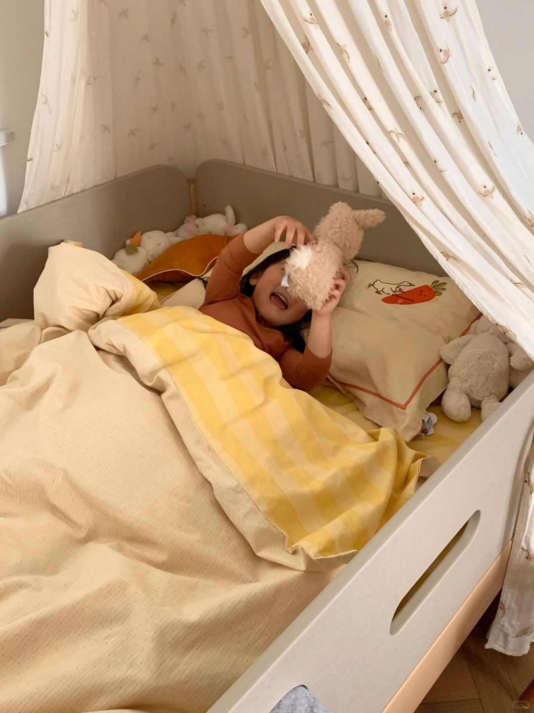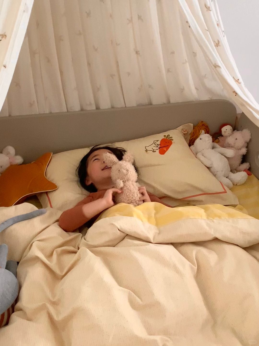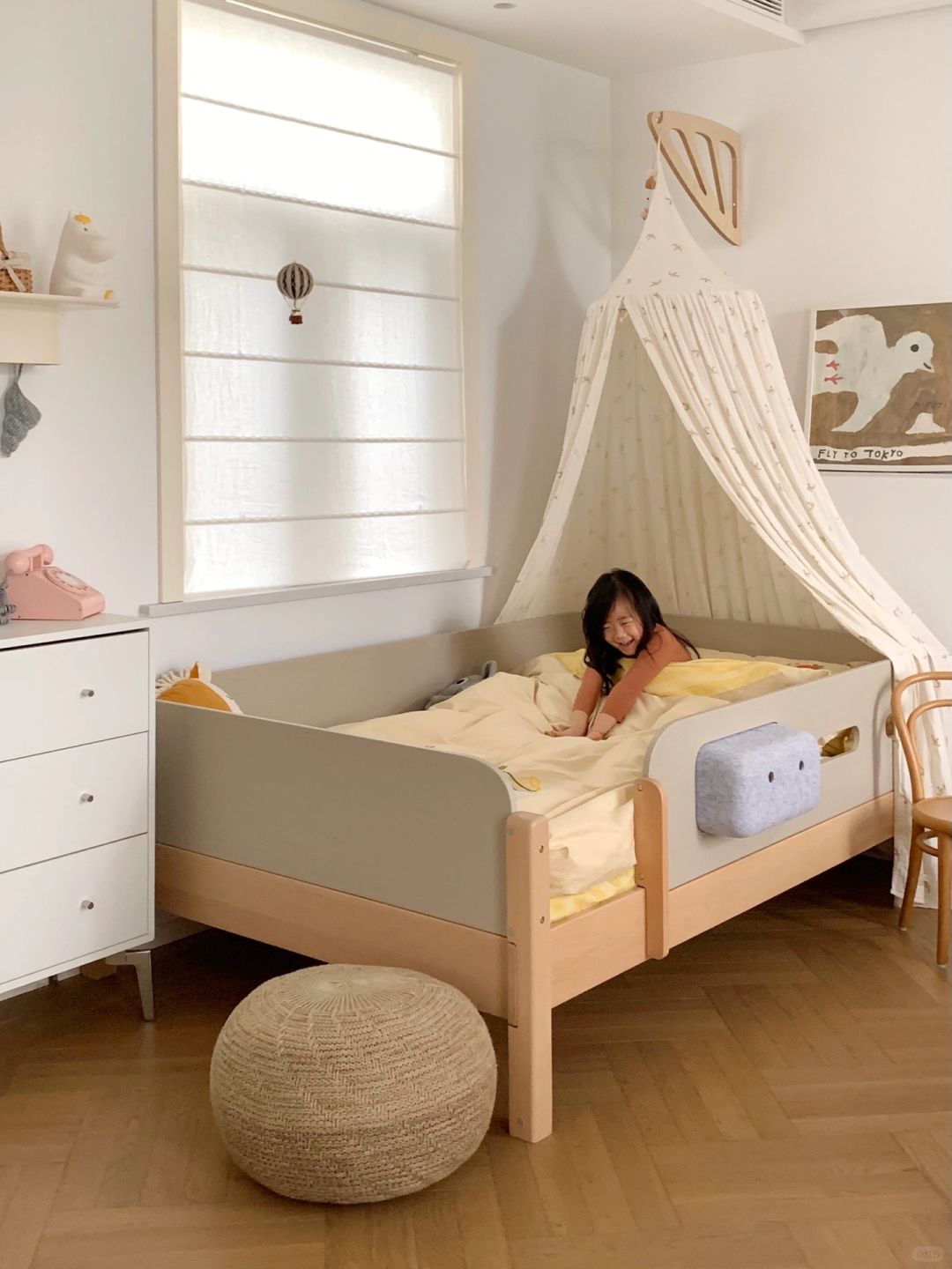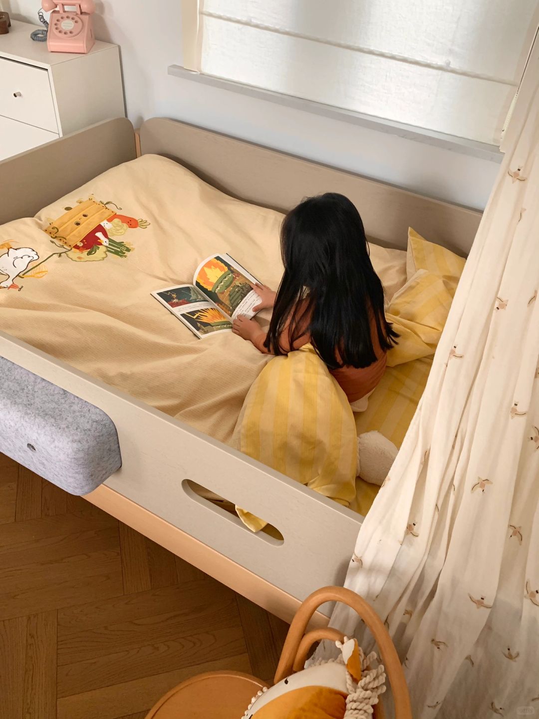 上海已经体感入冬,夜里温度只有个位数,女儿的同学们都开始咳嗽流鼻涕,问下来大家都一样,踢被子。 所以我们家也在入冬前,给女儿换了更大尺寸的盖被,我们家的儿童床是120*200cm的,被子选了罗莱儿童鹅绒被的150*215cm,套件也是他家的,磨毛+鹅绒,主打一个:再怎么打转都转不出来,四周不钻风,虽然听起来有点好笑,但效果很好,真的没有流鼻涕。 分享下挑选儿童床和床品的心得: 1⃣️床的尺寸 120cm宽度的床虽然比较大,但是因为更大更长的被子,才能让小朋友翻身的时候不露出后背,不露出小脚,所以我还是今年给女儿换了这个尺寸的儿童床,身高接近120cm的话,基本也就不会在床里打转了,150*215cm规格的单人被,真的可以扛住小朋友各种大动作。为什么不用小床+大被子的组合呢?因为他们真的不喜欢被子压在身体下面,更喜欢舒展的四肢,所以大床确实是空间足够情况下的首选。 2⃣️被芯的挑选 我们现在这条被芯,是罗莱的罗小羽儿童鹅绒被,侧面看是加厚的,蓬松度高,你可以在家里用挂烫机做实验,贴着被子,在另一侧你能感受到强烈的挂烫机的暖风,好的鹅绒被不仅保暖性好,透气也好,所以刚入睡的时候不会闷出汗,导致孩子掀开被子睡,后半夜着凉。 而且这款被芯鹅绒的清洁度高,标签上也能清楚看到是A类标准,比很多儿童服装的标准都高了,反正我这个鼻炎患者贴着闻也不会打喷嚏。 更加让我笃定要选它的理由是,它有分区填充,在手臂两侧和脚部这三边,被子的绗缝是斜向下的,更贴合小朋友的睡姿,这样不容易拱起来漏风。 3⃣️被套的选择 冬天真的首选磨毛,但是找舒服透气的磨毛是有难度的,很多被套用下来的感觉反而是不透气,闷汗,我们家的全棉磨毛三件套也是在罗莱选的,它的保暖性很好,体感可以升高6℃,初次使用的时候就感觉被套里面很干净,不像别的被子会有飞絮,它的脱毛做得很好,不易起球,这样也就不用一两年就更换了。 舒适过冬,真的是每一个南方人的梦想,希望这篇种草还不算晚,给小朋友换一床被子,温暖地等待开春吧。