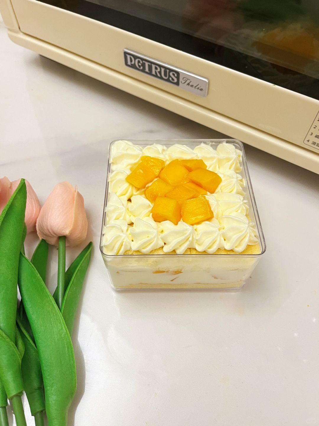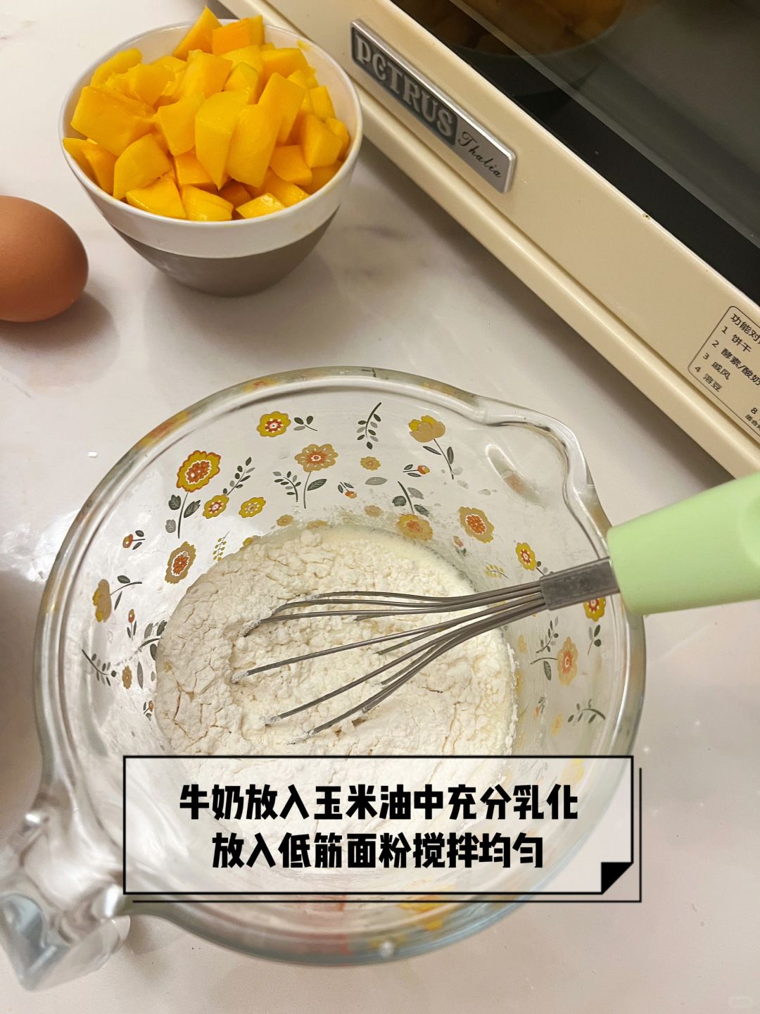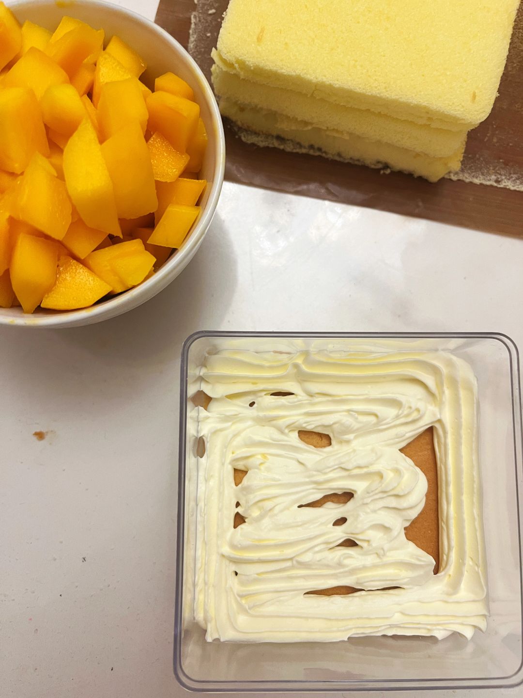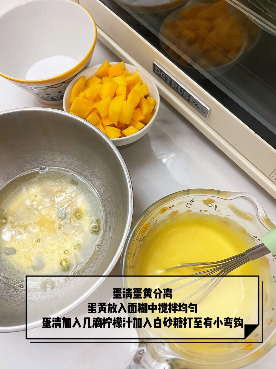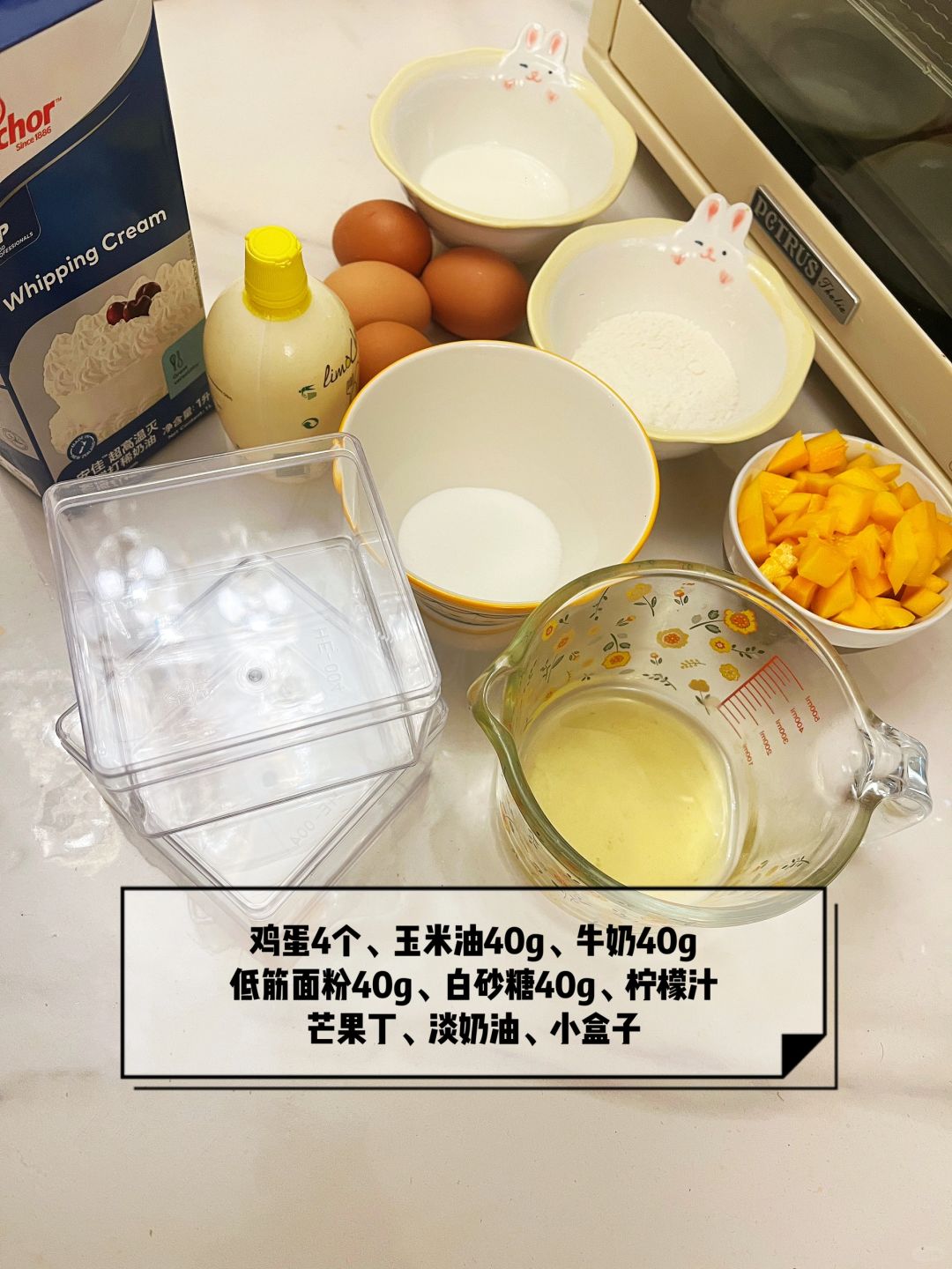 4个鸡蛋 40g低筋面粉 芒果丁 淡奶油 小方盒