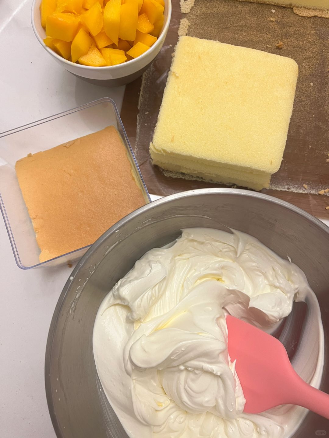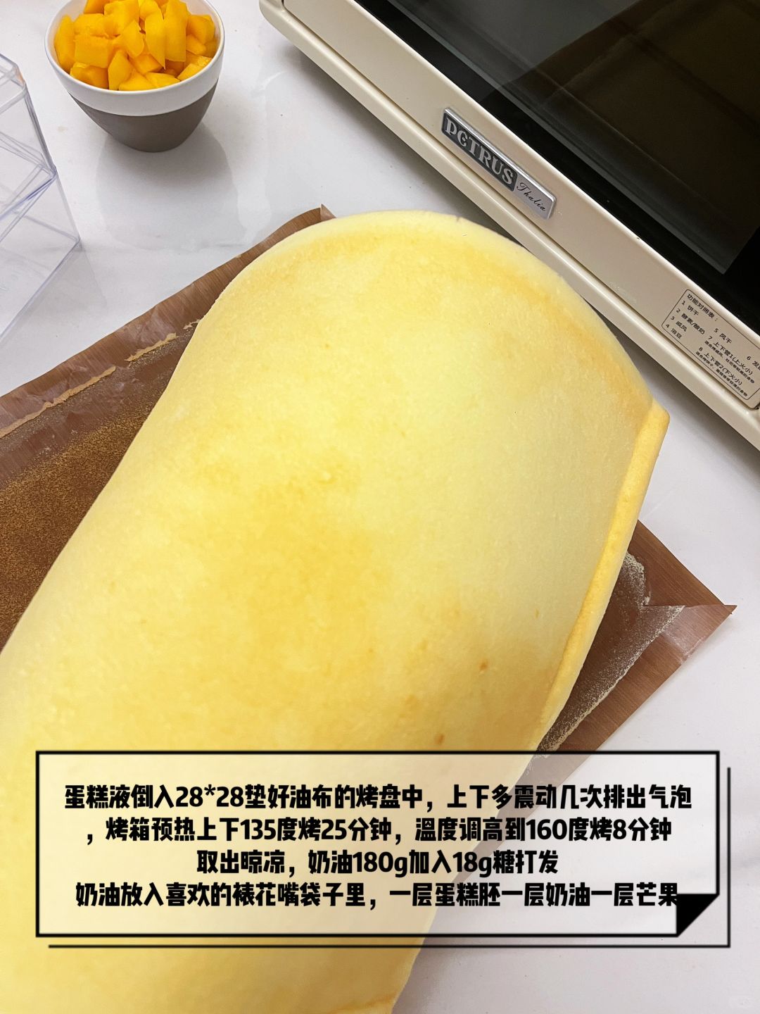 7、拿出晾凉,180g淡奶油加18g糖打发,放入自己喜欢的裱花嘴袋里,一层蛋糕坯一层奶油一层芒果组装就完成啦[派对R][派对R][派对R]