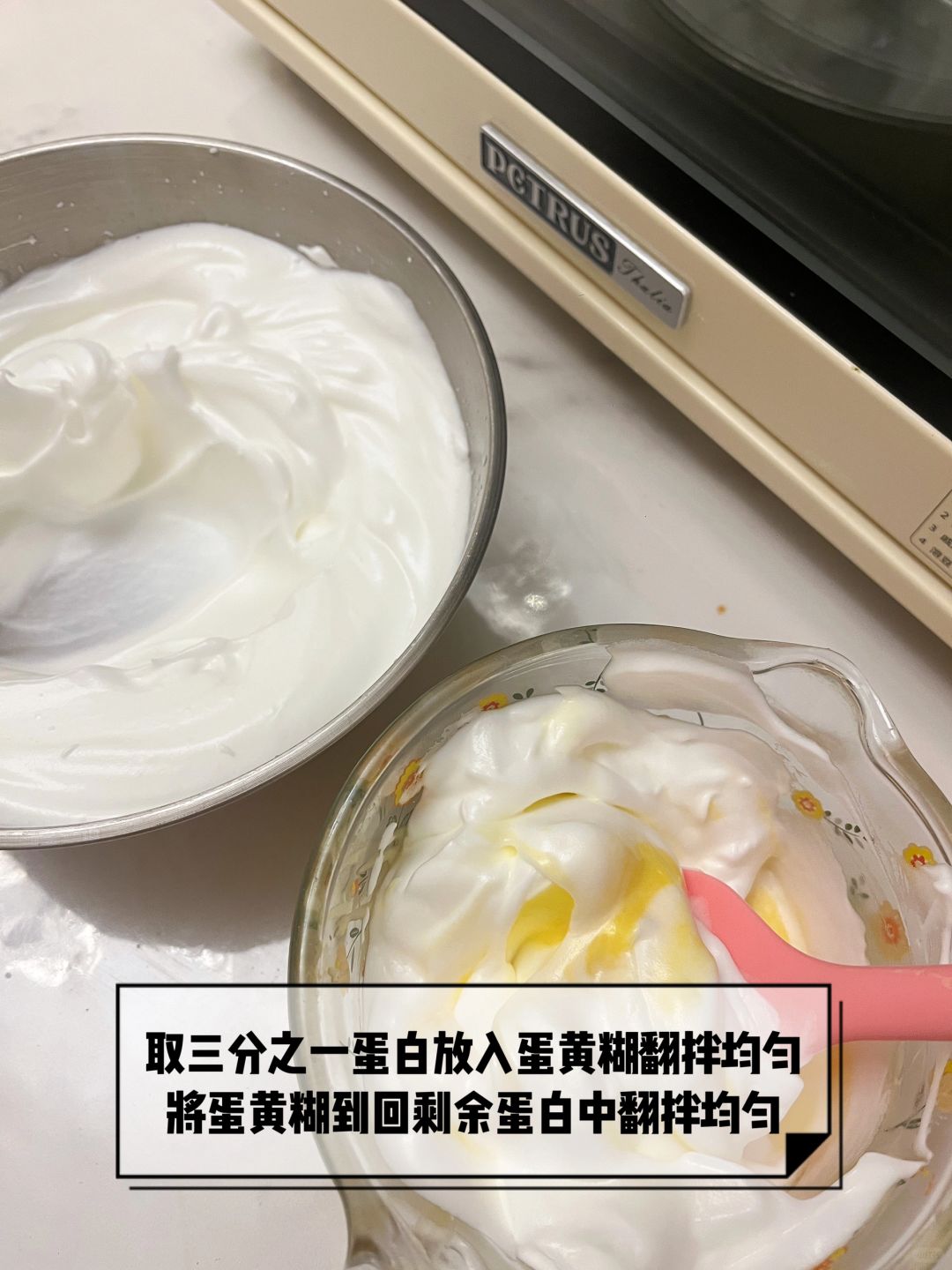 4、取1/3蛋清放入蛋黄糊z字翻拌均匀,倒回剩余蛋清中翻拌均匀