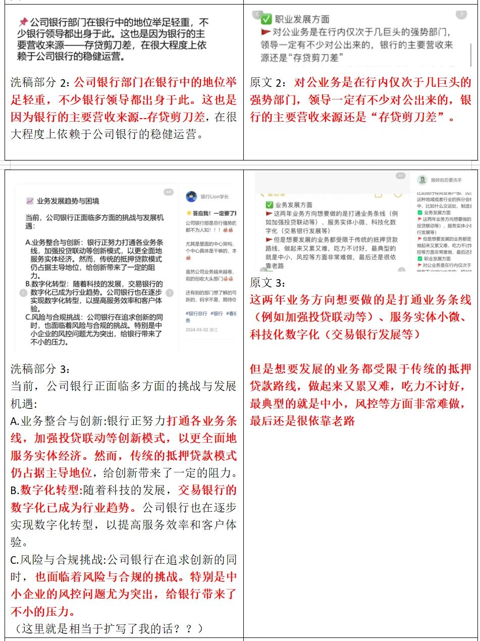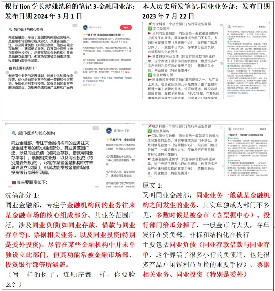 其中在对方卡中心、公司部、授信审批部、同业业务部的笔记中均采用上述方式进行洗稿。笔记的整体布局表现为